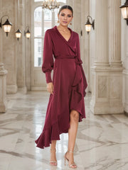 Burgundy V-Neck Long Sleeves Tie Waist Ruffle Asymmetrical Midi Mother of the Bride Dresses