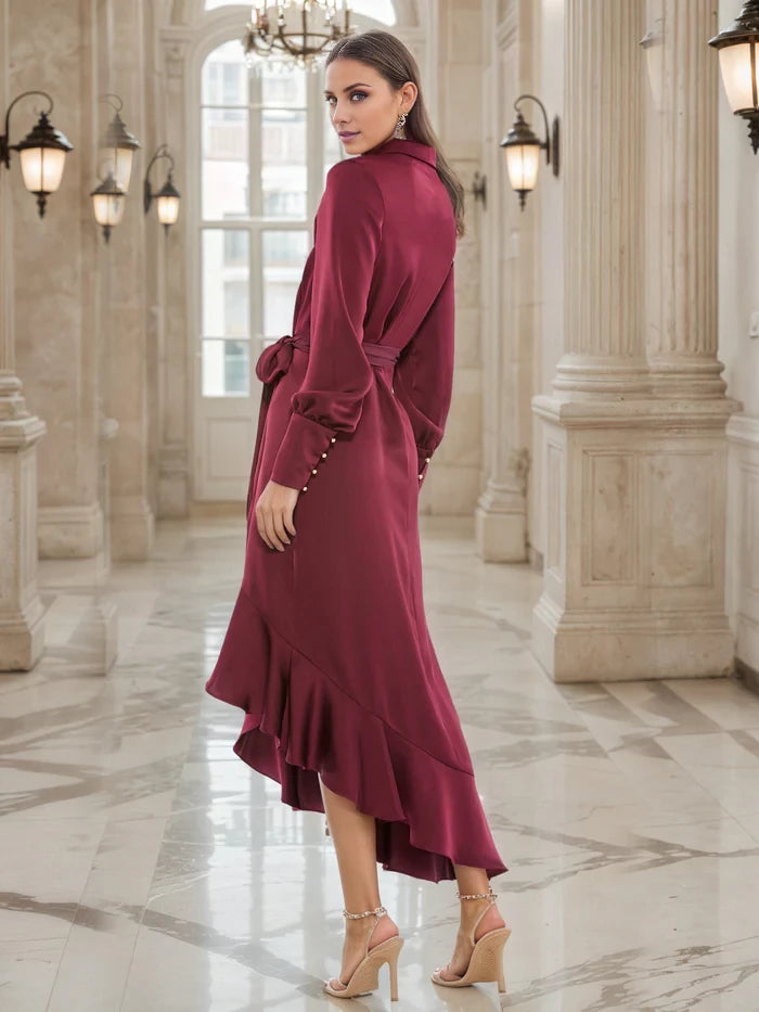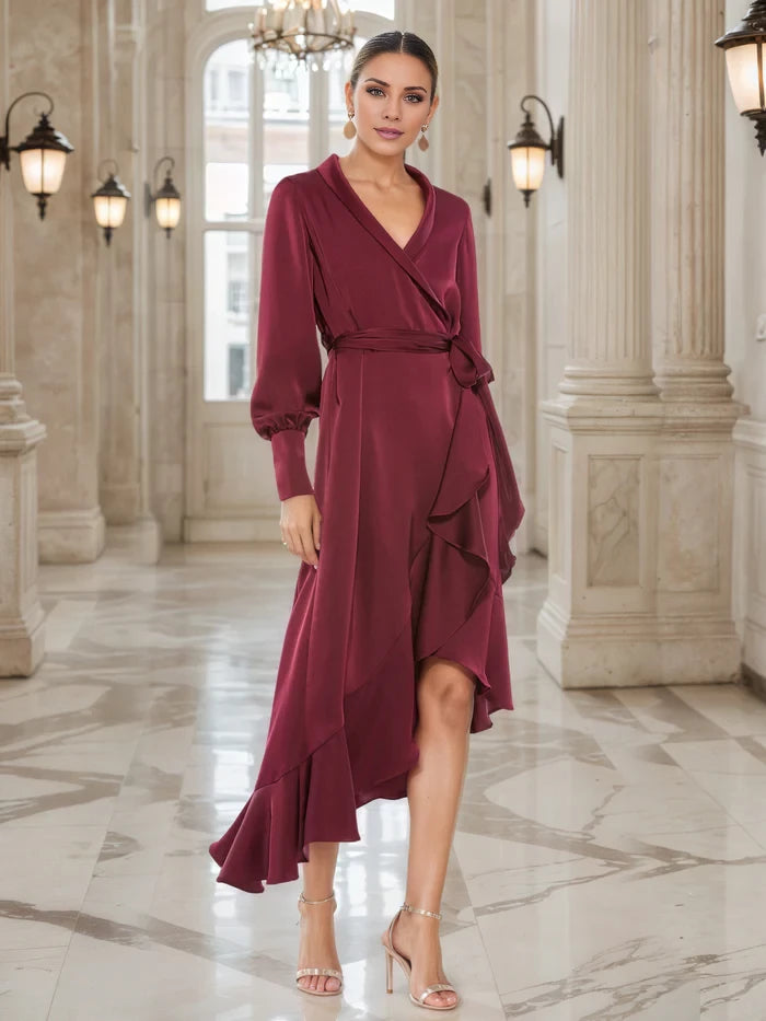 This burgundy mother of the bride dress features a V-neckline, long sleeves, and a tie waist that accentuates the figure. Its asymmetrical midi hem with ruffle detailing offers an elegant and sophisticated silhouette, perfect for formal occasions.