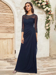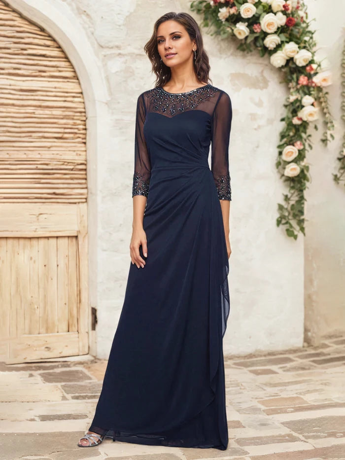 Dark Navy Mother Of The Bride Gown A Line Illusion Sleeves Beaded Mother of the Bride Dresses