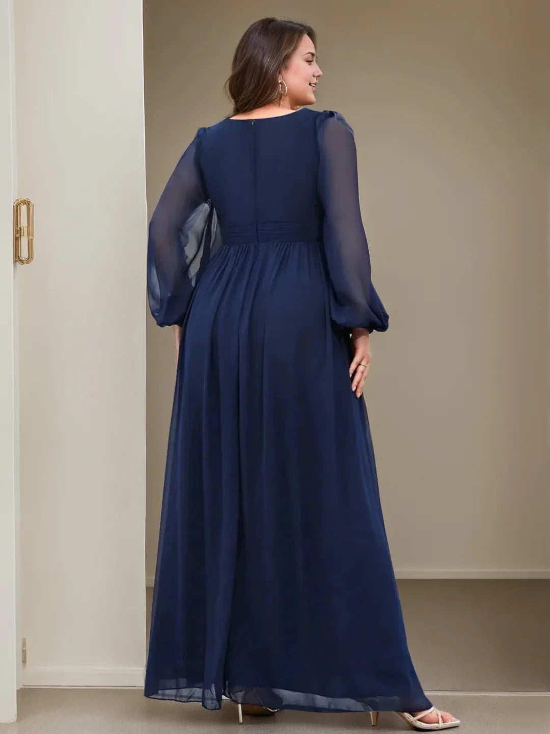 Elegant A - Line Plunging V - Neck Bishop Sleeve Zipper Back Floor - Length Mother of the Bride Dresses