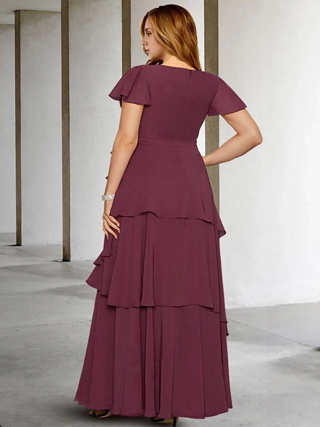 Elegant A - Line Plunging V - Neck Flutter Sleeve Zipper Back Floor - Length Plus Size Mother of the Bride Dresses