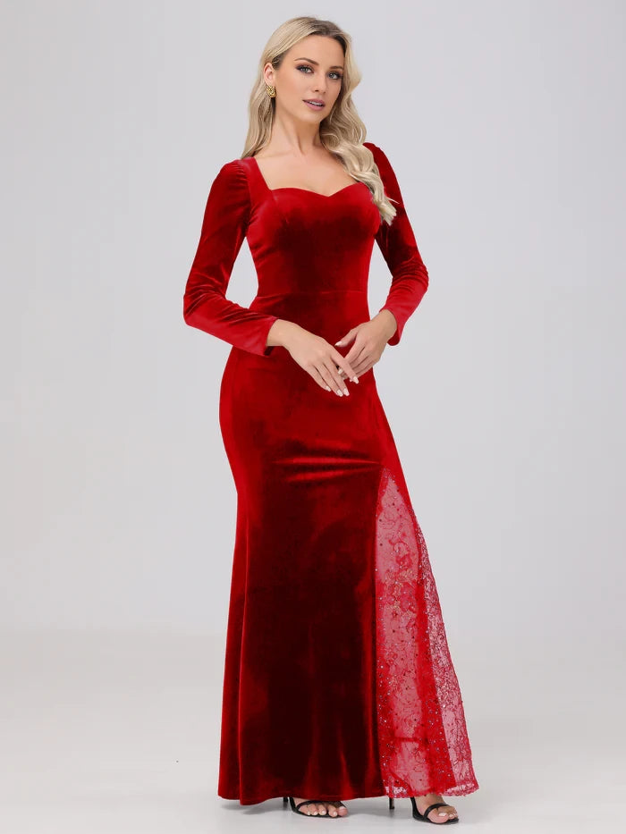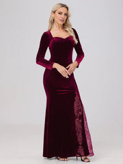 Elegant Sweetheart Long Sleeves Patchwork Sequin Lace Velvet Mother of the Bride Dresses - Burgundy / US 2 / UK 6 / EU 32