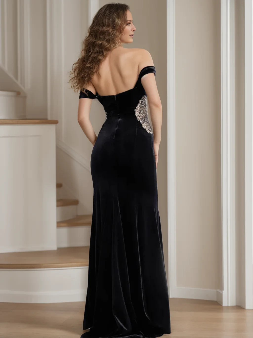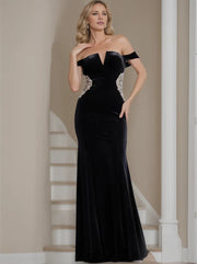 Elevate the mother of the bride's look with this glamorous mermaid - style dress. Crafted from luxurious velvet in a deep black hue, it features an off - shoulder neckline and cap sleeves. Adorned with sparkling side embellishments, the zipper back ensures a secure fit, while the floor - length silhouette exudes sophistication. Perfect for weddings, blending elegance and allure.