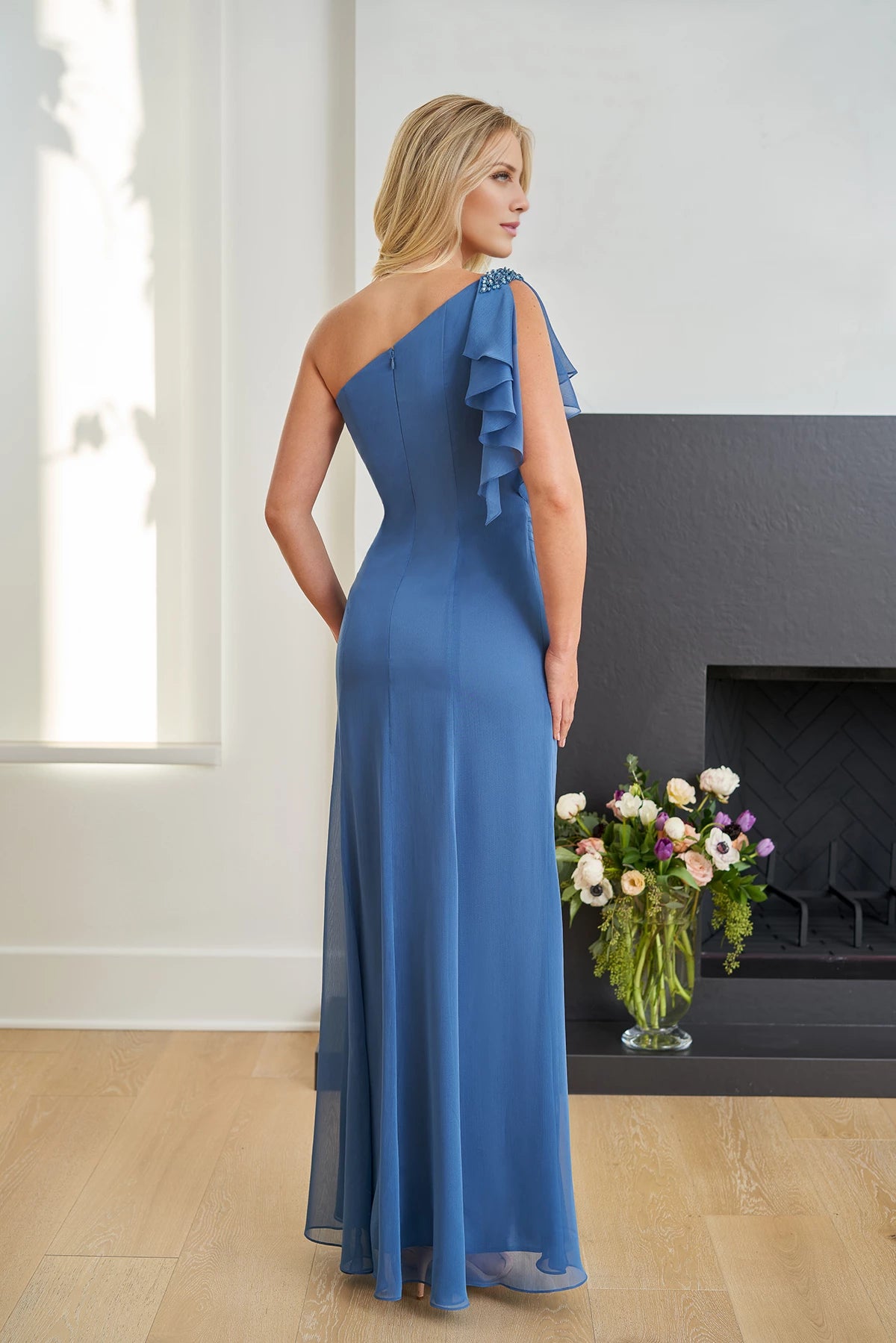 This stunning chiffon fit-and-flare gown features a fashionable one-shoulder neckline and an asymmetrical ruched side, making it an elegant choice for mothers of the bride.