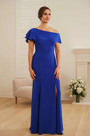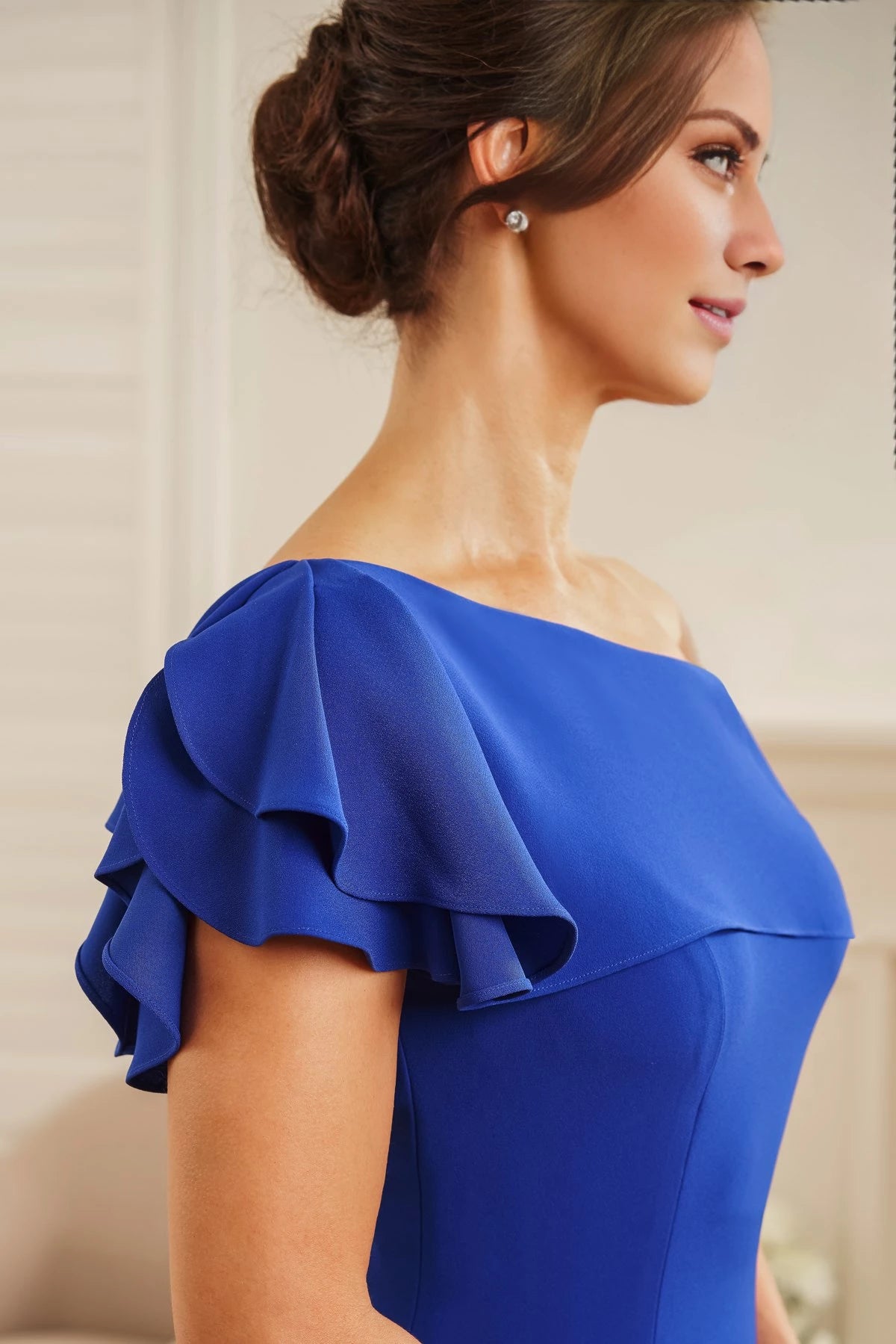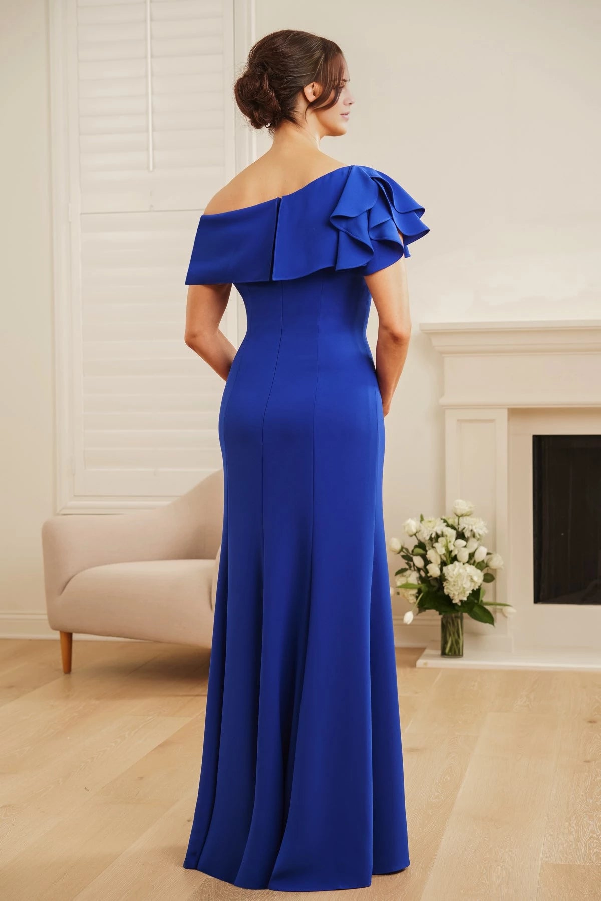 This elegant gown features a soft crepe fabric with princess seams for a flattering fit and flare silhouette. Designed with a one-shoulder flounce neckline and delicate ruffle details, it is an exquisite choice for the mother of the bride.