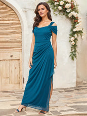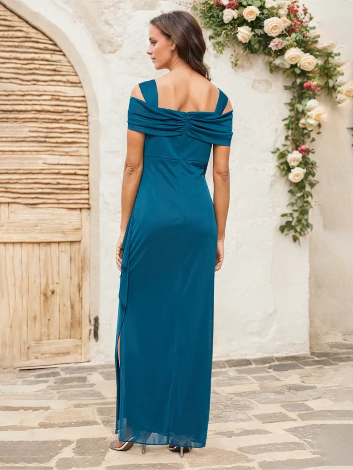This elegant ink blue mother of the bride dress features an off-the-shoulder design crafted from flowing chiffon, offering a graceful and timeless look for special occasions. Its long silhouette ensures a sophisticated presence, perfect for celebrating with style and comfort.