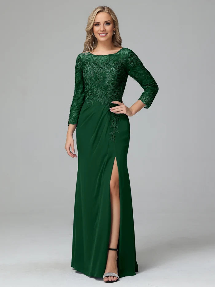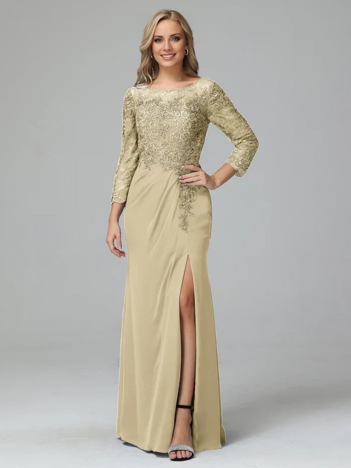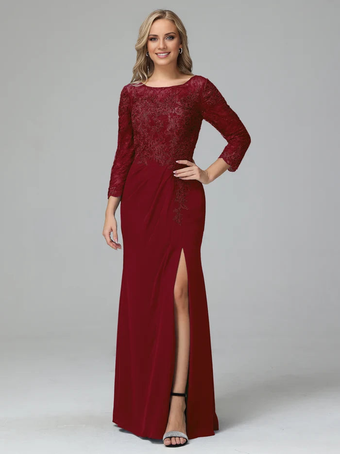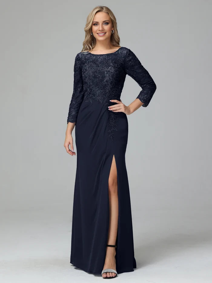 Elegant mother-of-the-bride gown featuring long sleeves and a floor-length design crafted from delicate chiffon and lace.