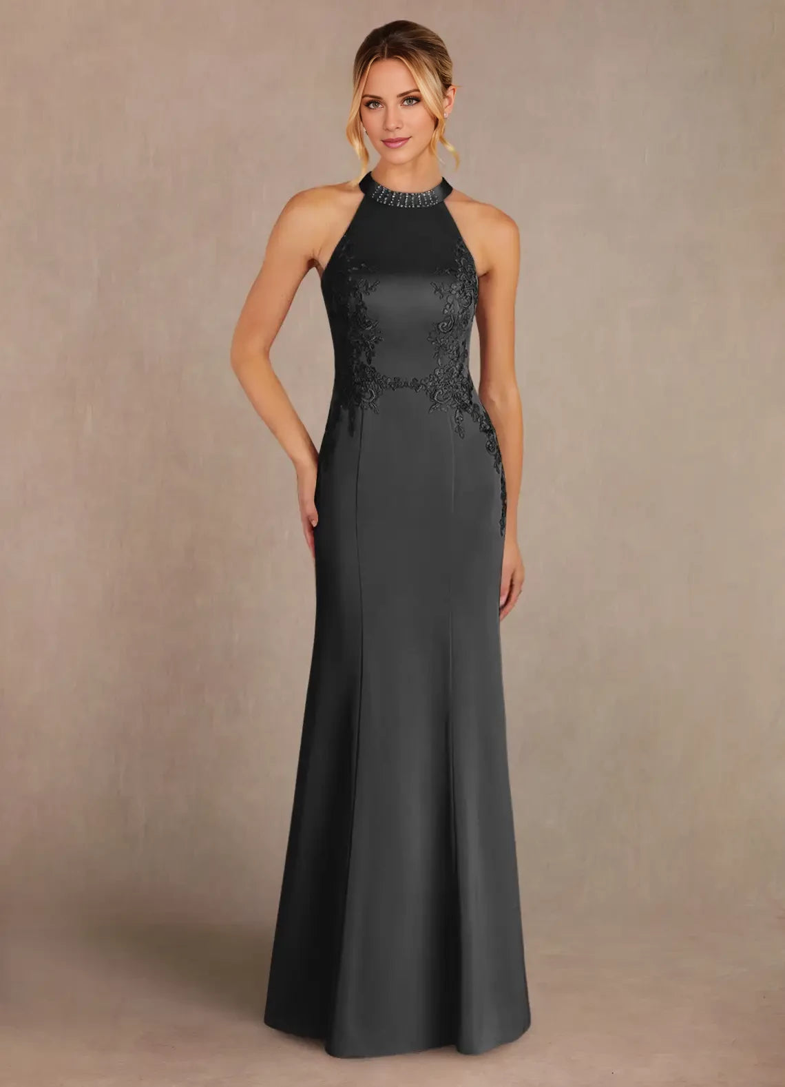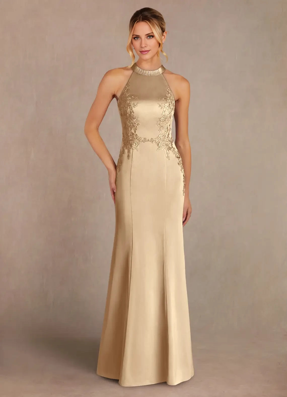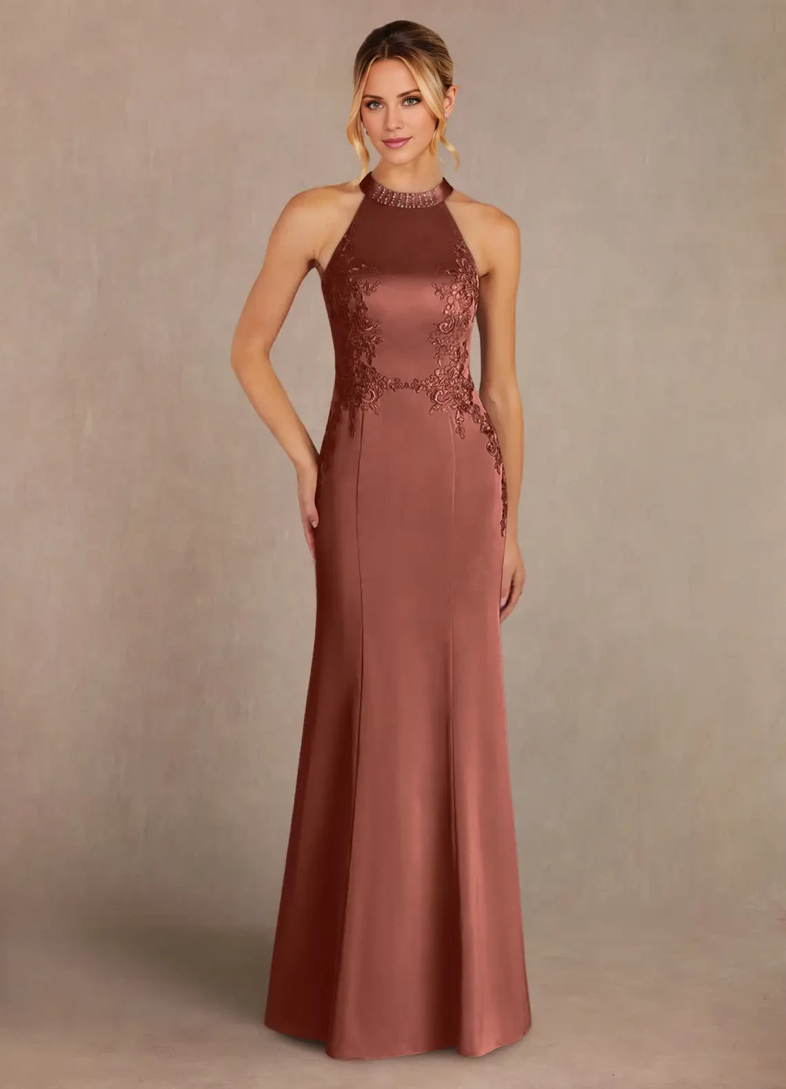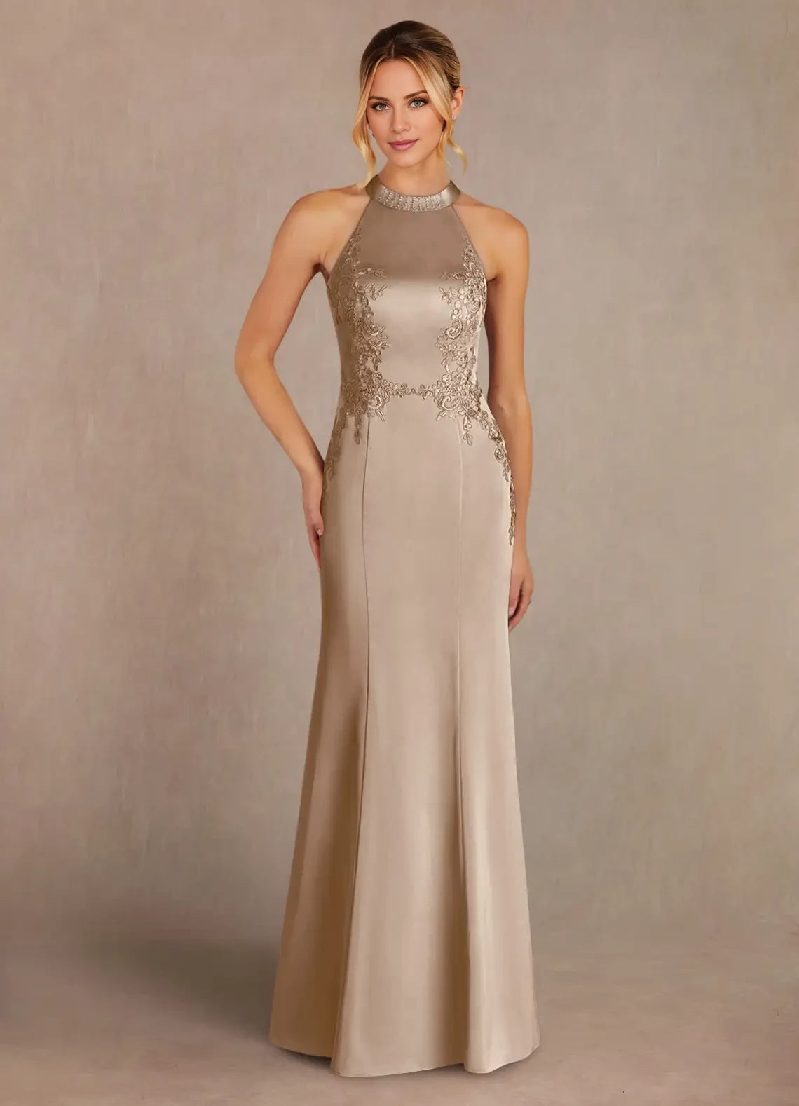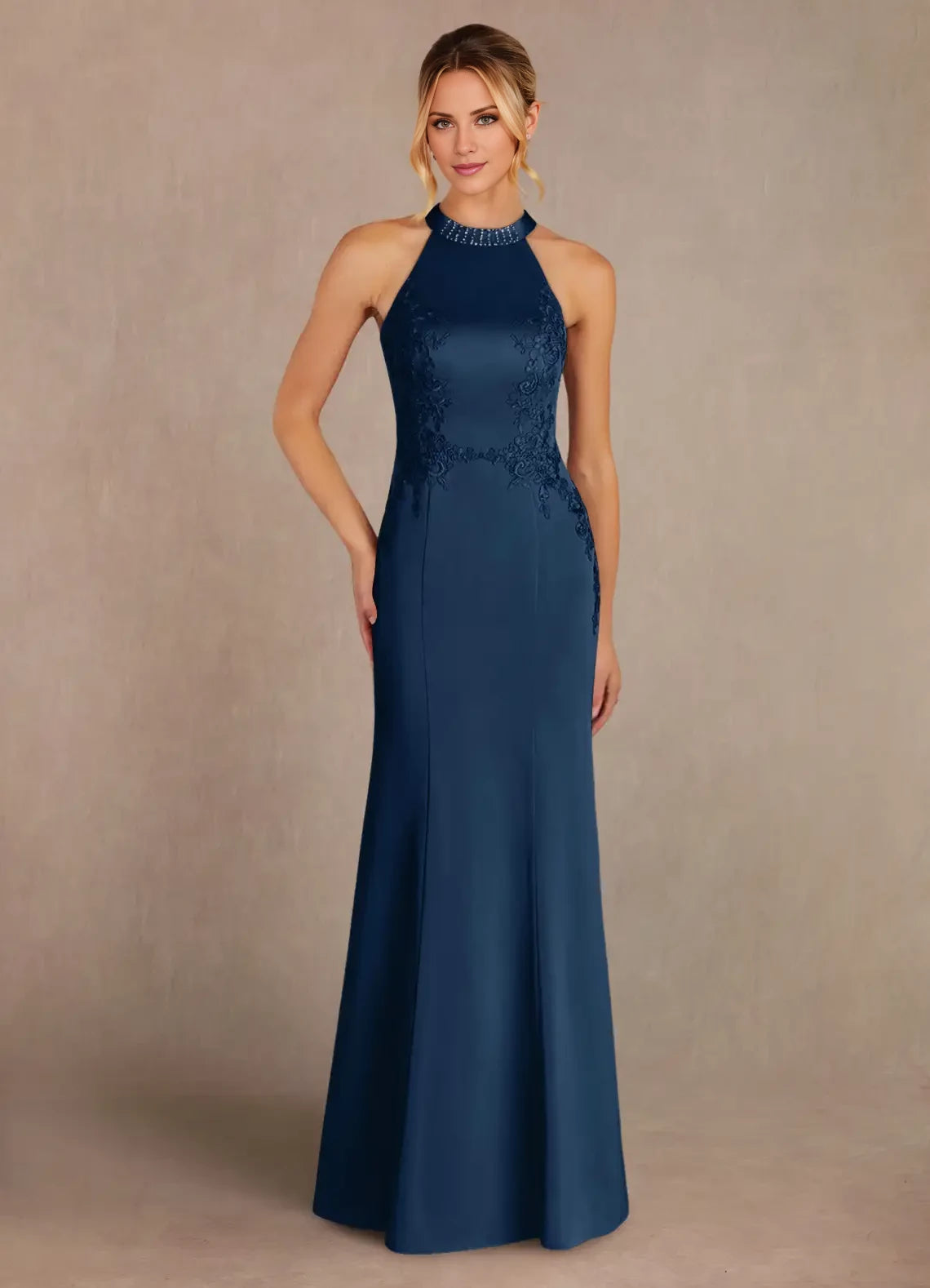 This elegant mermaid-style dress combines luxurious satin with delicate lace, designed specifically for mothers of the bride seeking a sophisticated and timeless look.