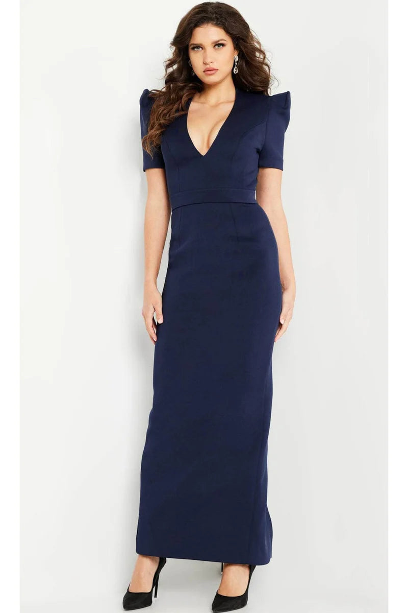 This navy column gown features elegant puff sleeves, designed specifically for mothers of the bride seeking a refined and sophisticated look.