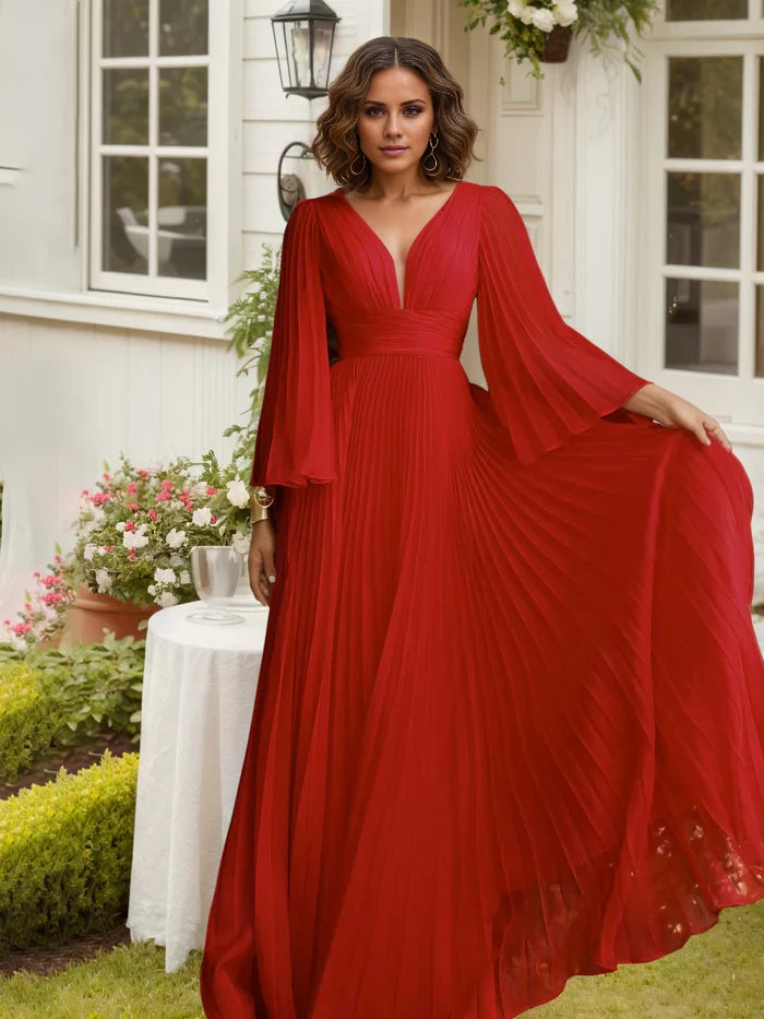 Elegant mother of the bride dresses featuring long sleeves and finely pleated chiffon fabric.