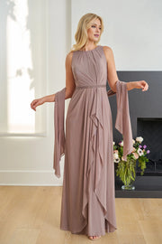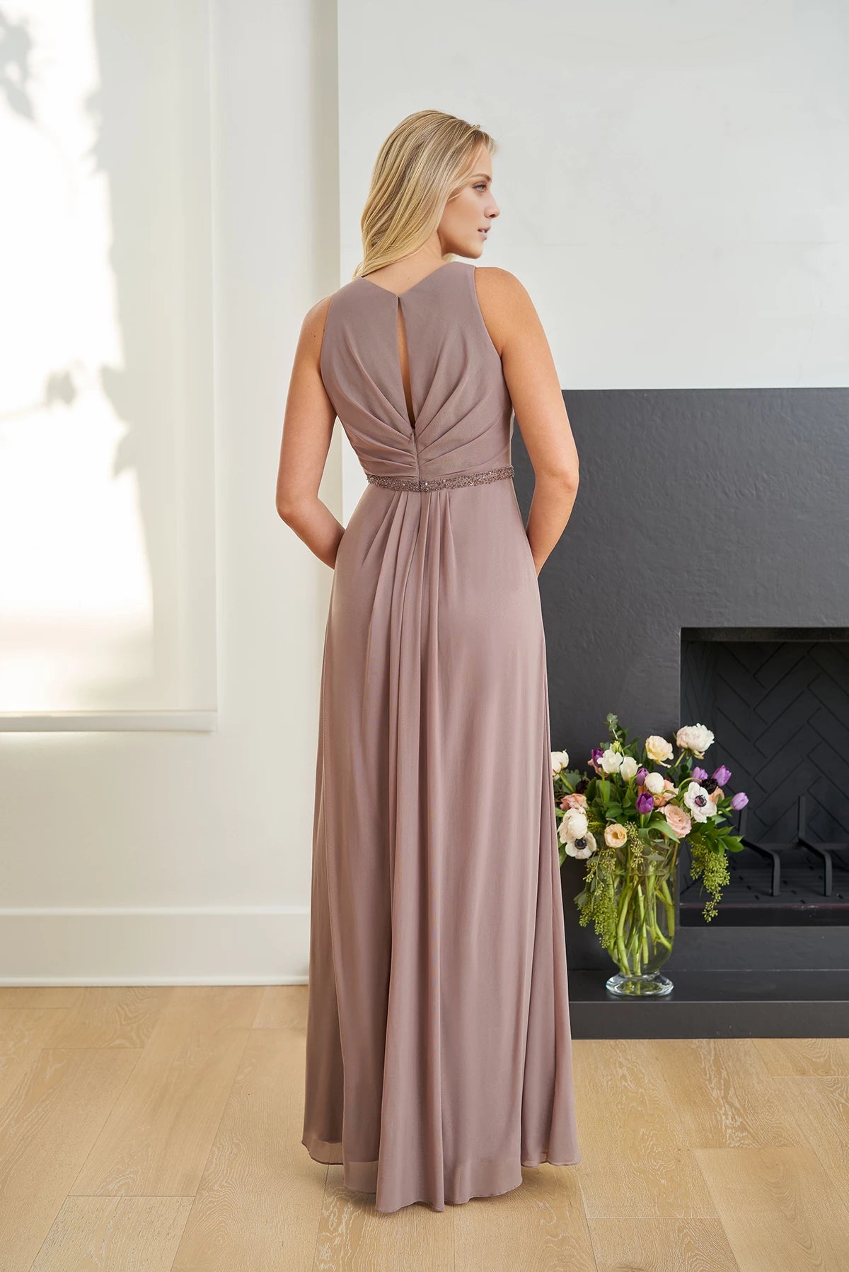 This elegant A-line gown features an illusion design with a jewel neckline and asymmetrical pleats, making it an exquisite choice for the mother of the bride.