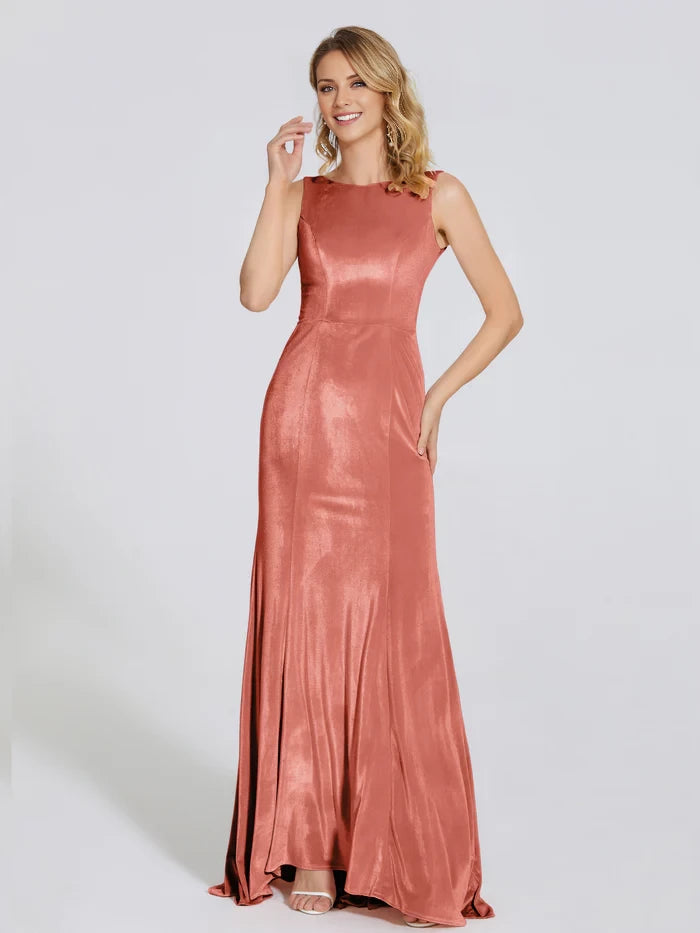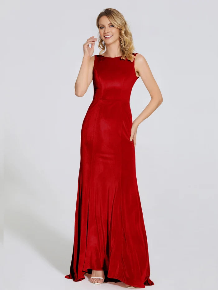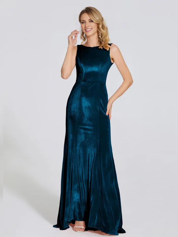 This velvet trumpet dress features a round, sleeveless neckline, designed specifically for mothers of the bride seeking an elegant and refined look.