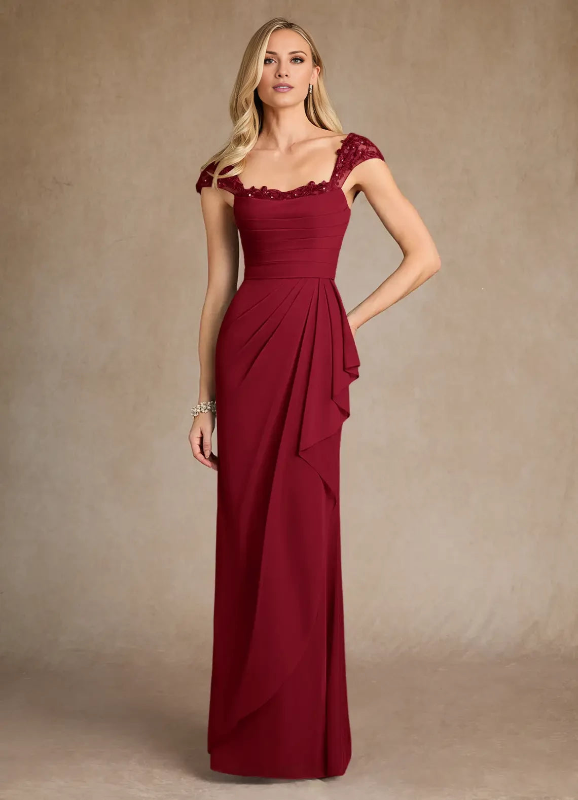 This sheath dress features delicate lace and mesh fabric, enhanced with elegant ruffles, making it an ideal choice for the mother of the bride.