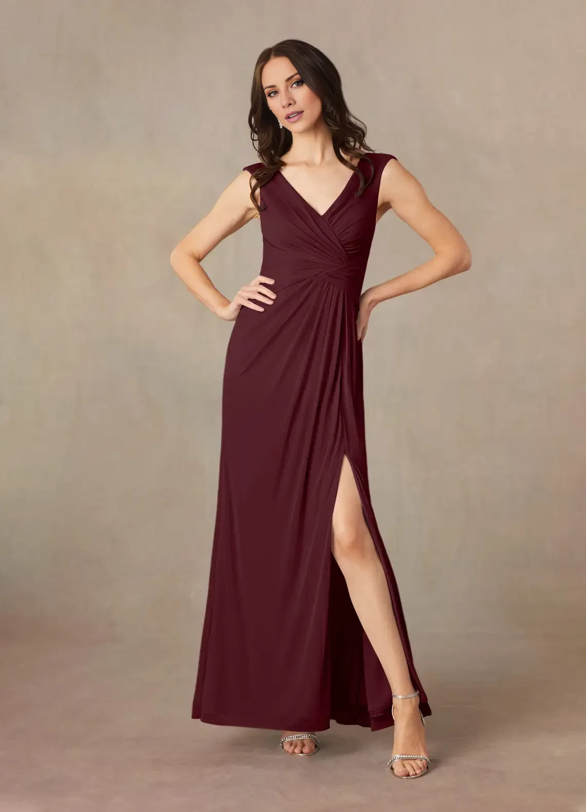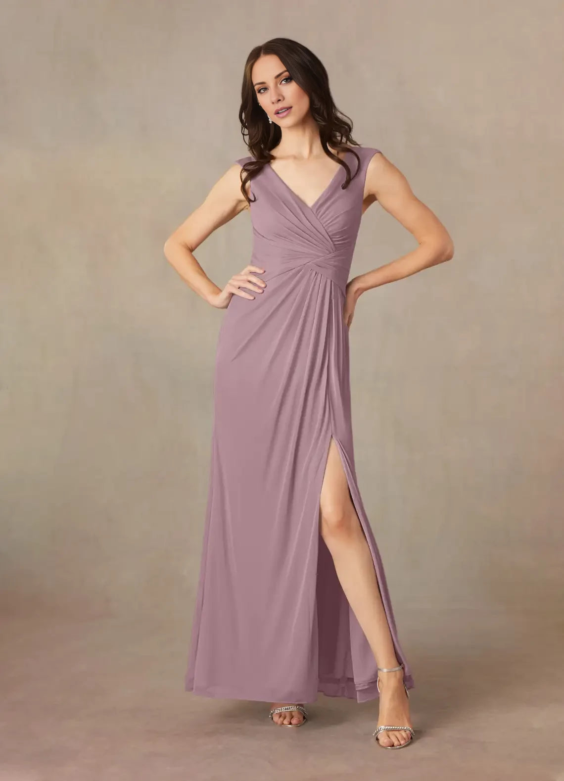 Elegant sleeveless mother-of-the-bride gown featuring a V-neckline, back zipper closure, floor-length design, and a side slit for added grace.