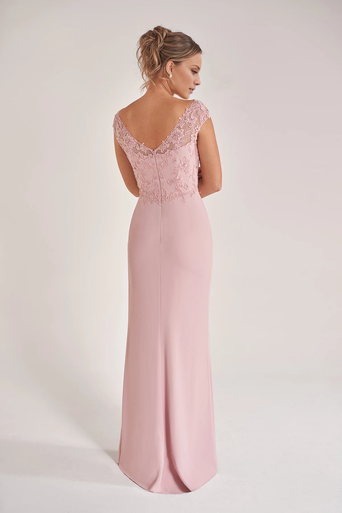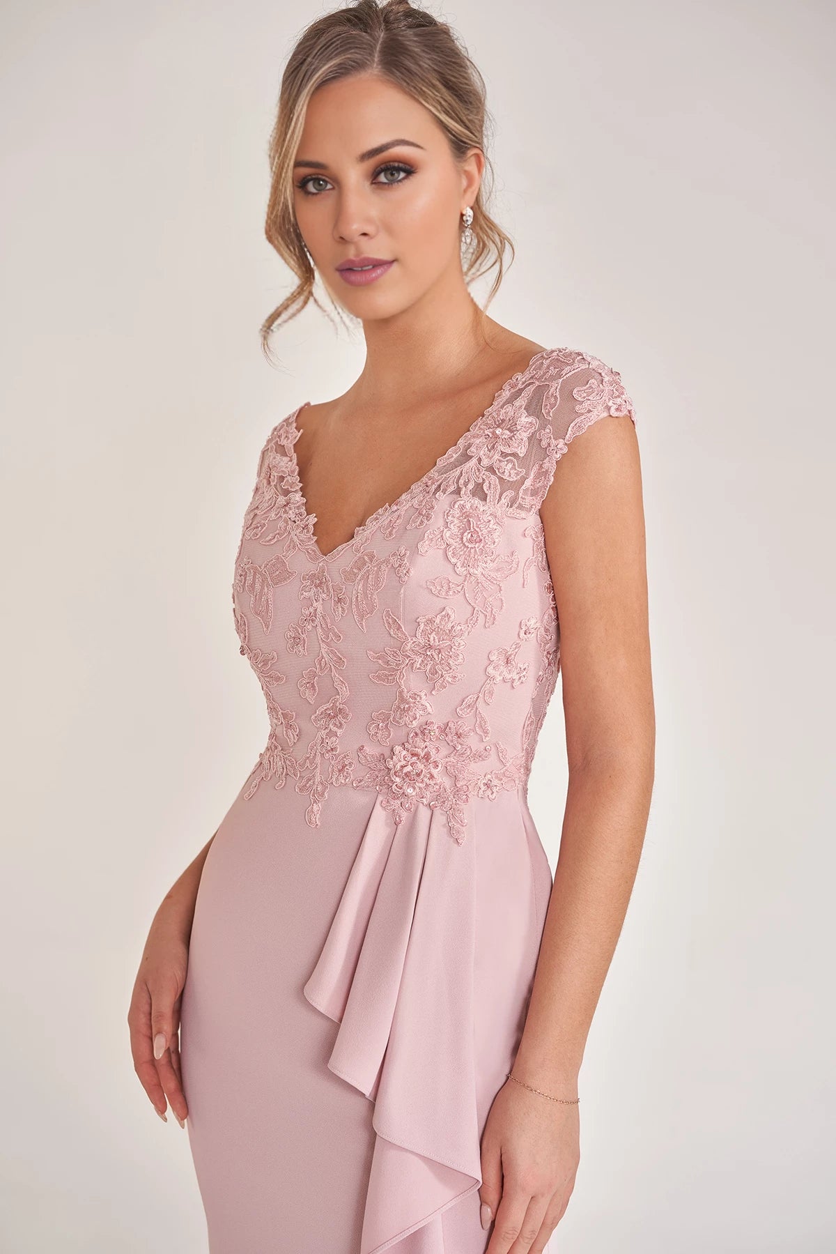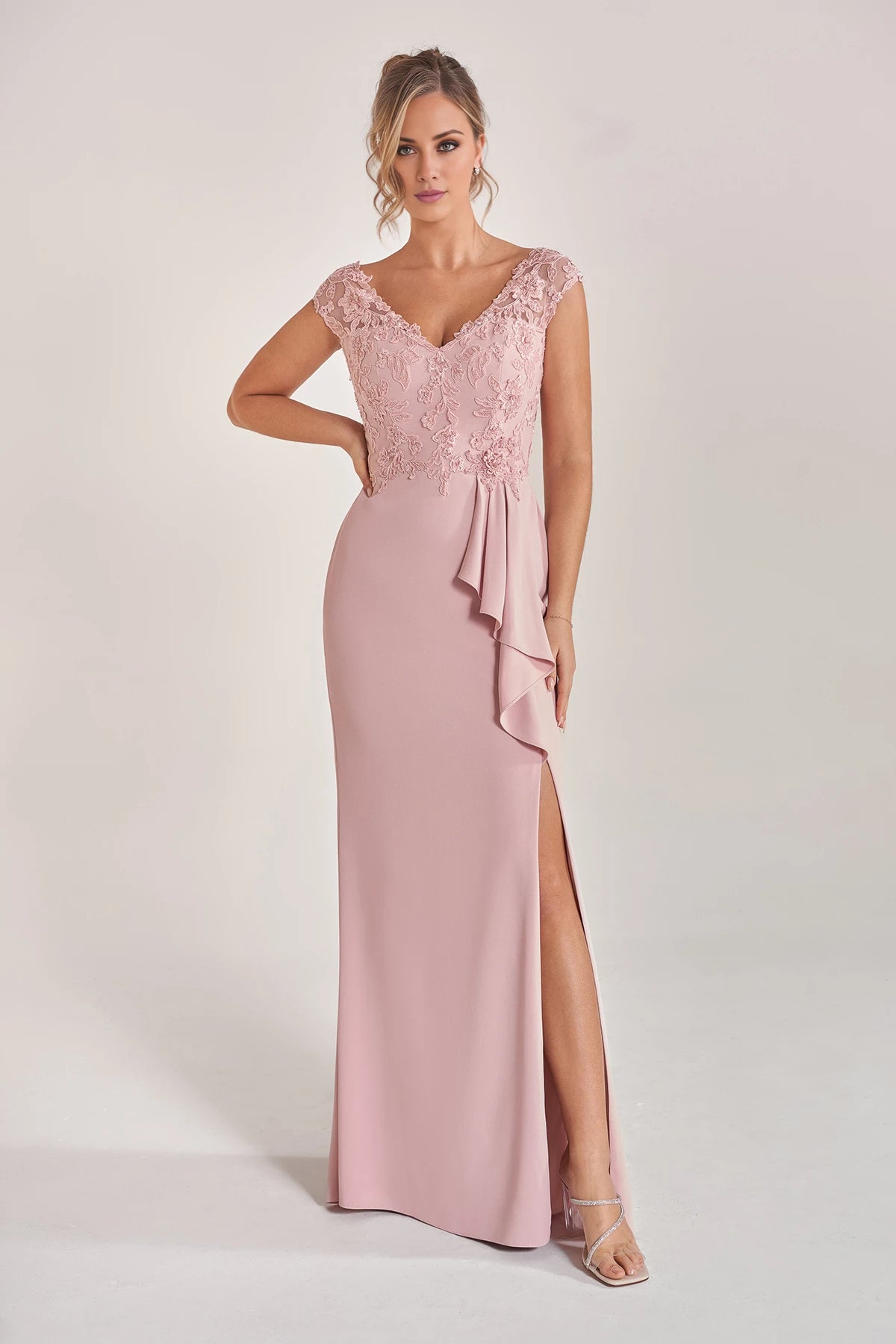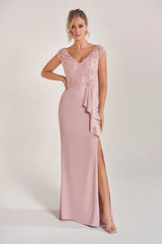 This elegant mother of the bride gown features a soft crepe fit-and-flare silhouette, complemented by a hand-beaded embroidered lace bodice and graceful cascading side ruffles for a refined and sophisticated look.