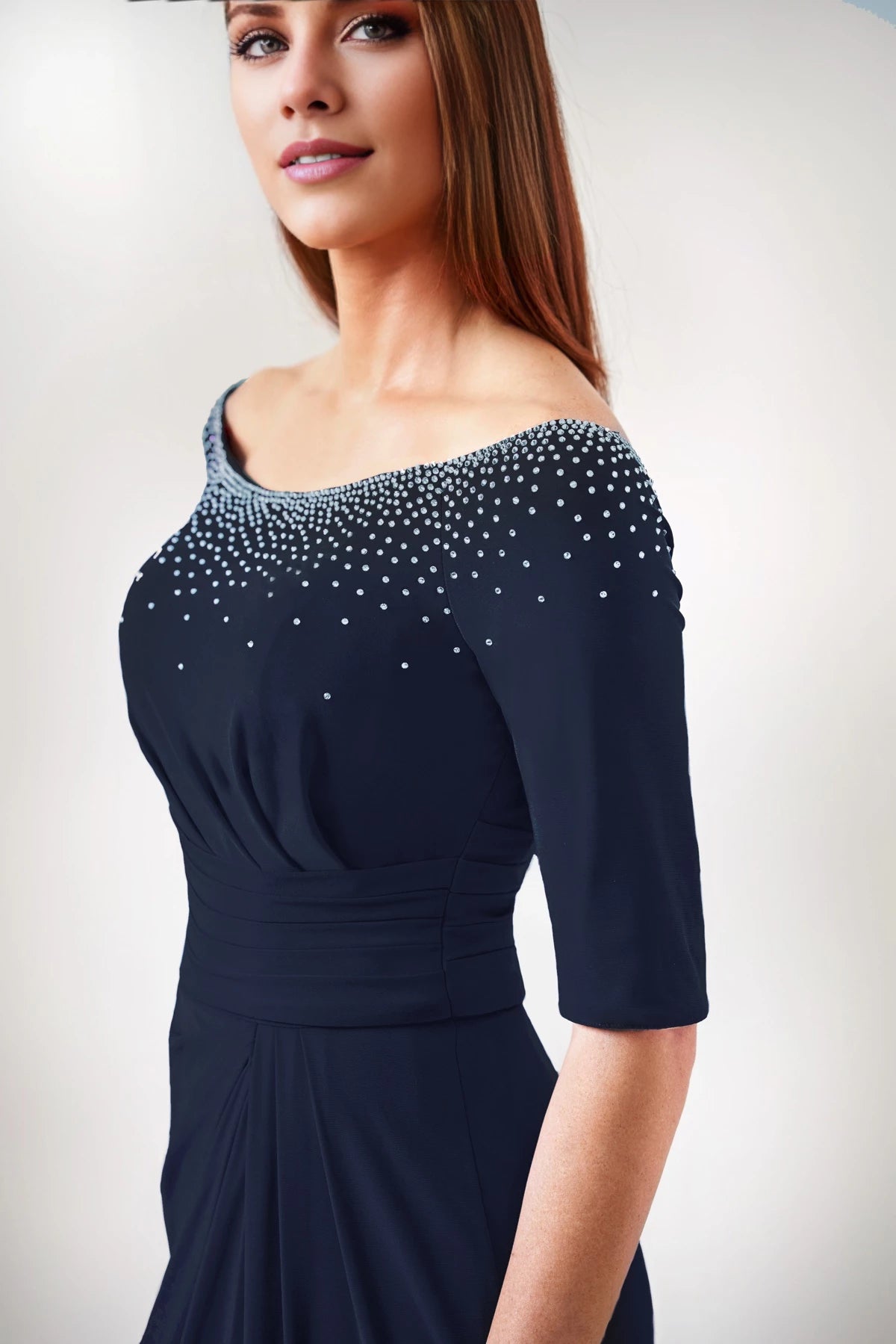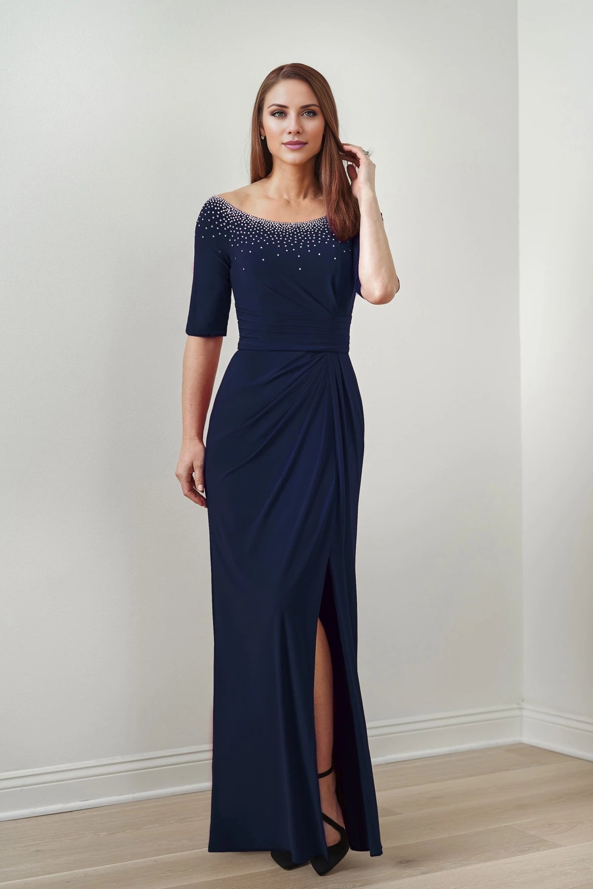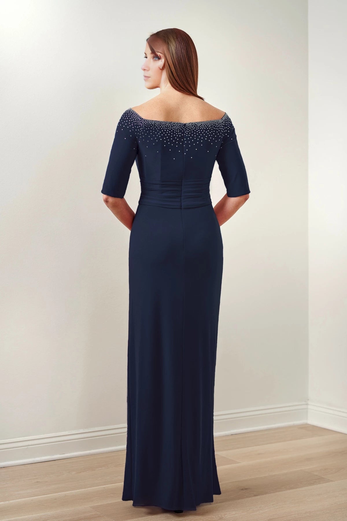 This elegant flare dress features a scattered rhinestone neckline and elbow-length sleeves, making it an ideal choice for mothers of the bride seeking a refined and flattering fit.