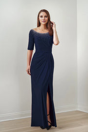 Splendid Fit Flare Dress with Scattered Rhinestoned Neckline and Elbow Length Sleeves Mother of the Bride Dresses