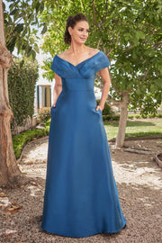 Elegant A-line dress featuring a portrait neckline and a high-waisted waistband, perfect for mothers of the bride.