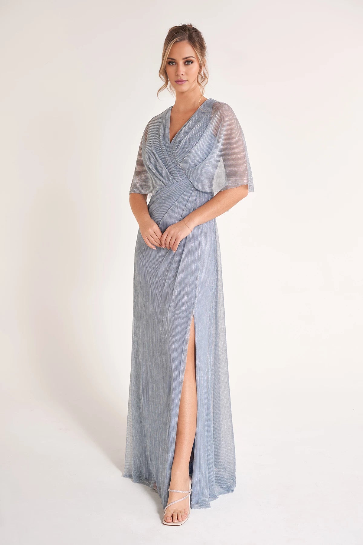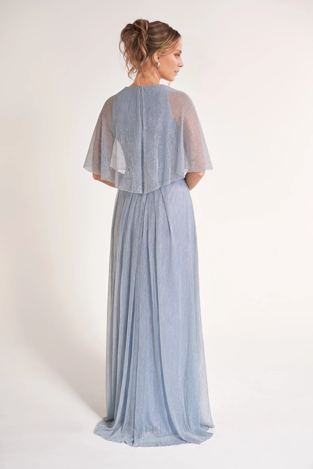 This elegant A-line dress features metallic pleated chiffon fabric, enhanced by side gathers and a flowing cape for a sophisticated silhouette.