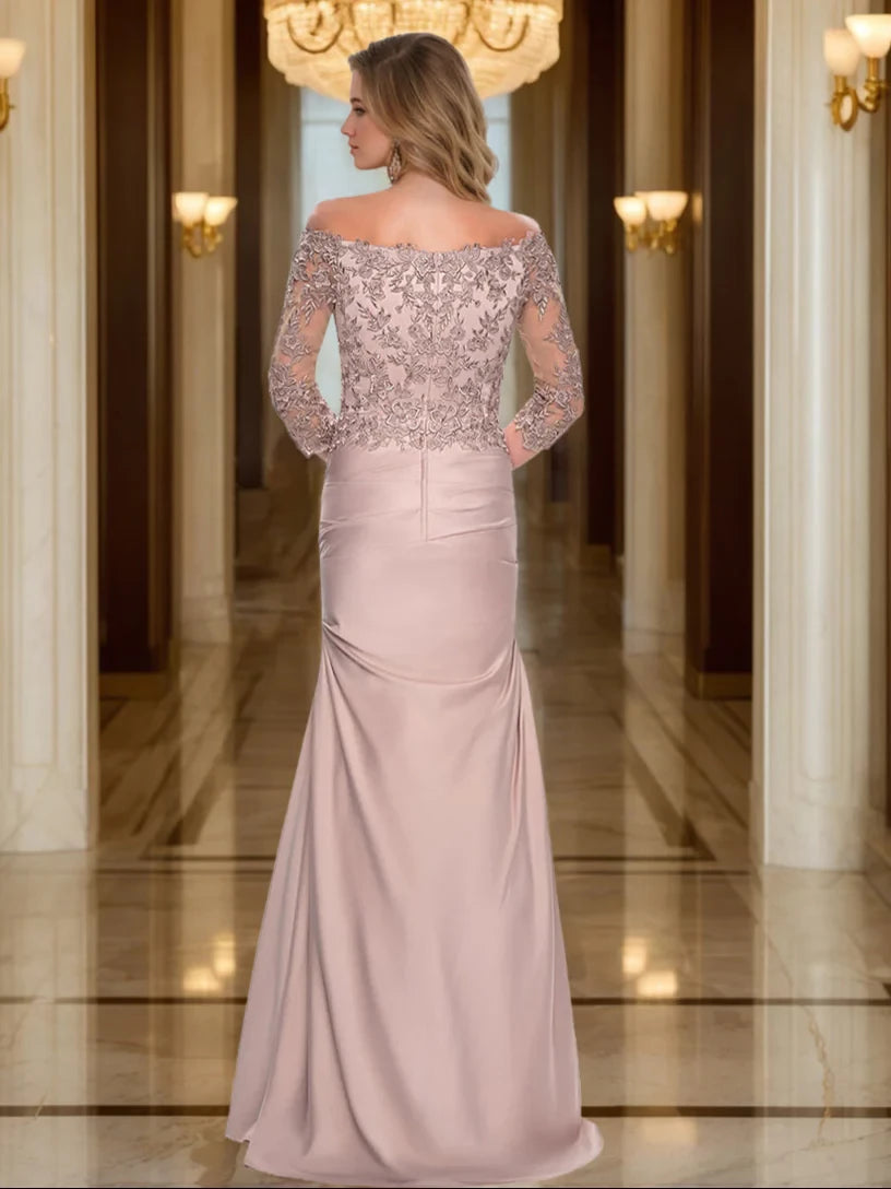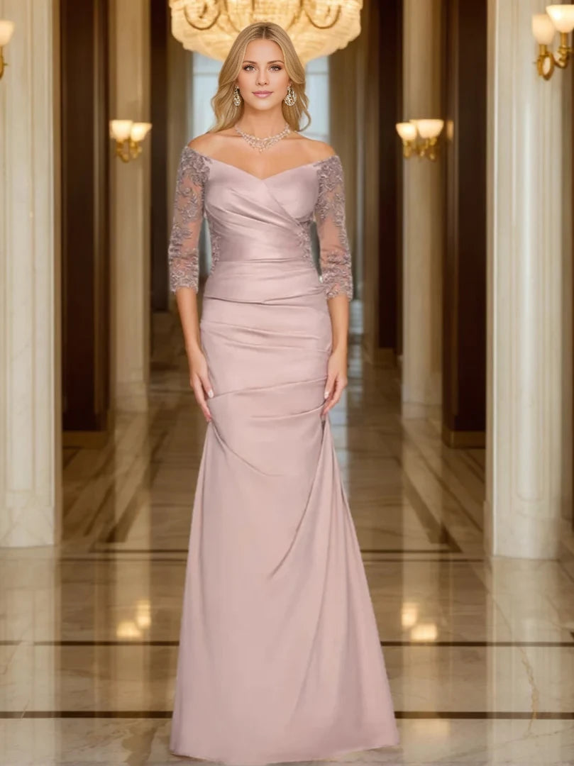 Elegant trumpet/mermaid silhouette mother-of-the-bride dress featuring a V-neckline, ruched detailing, and 3/4 sleeves, adorned with intricate appliques.