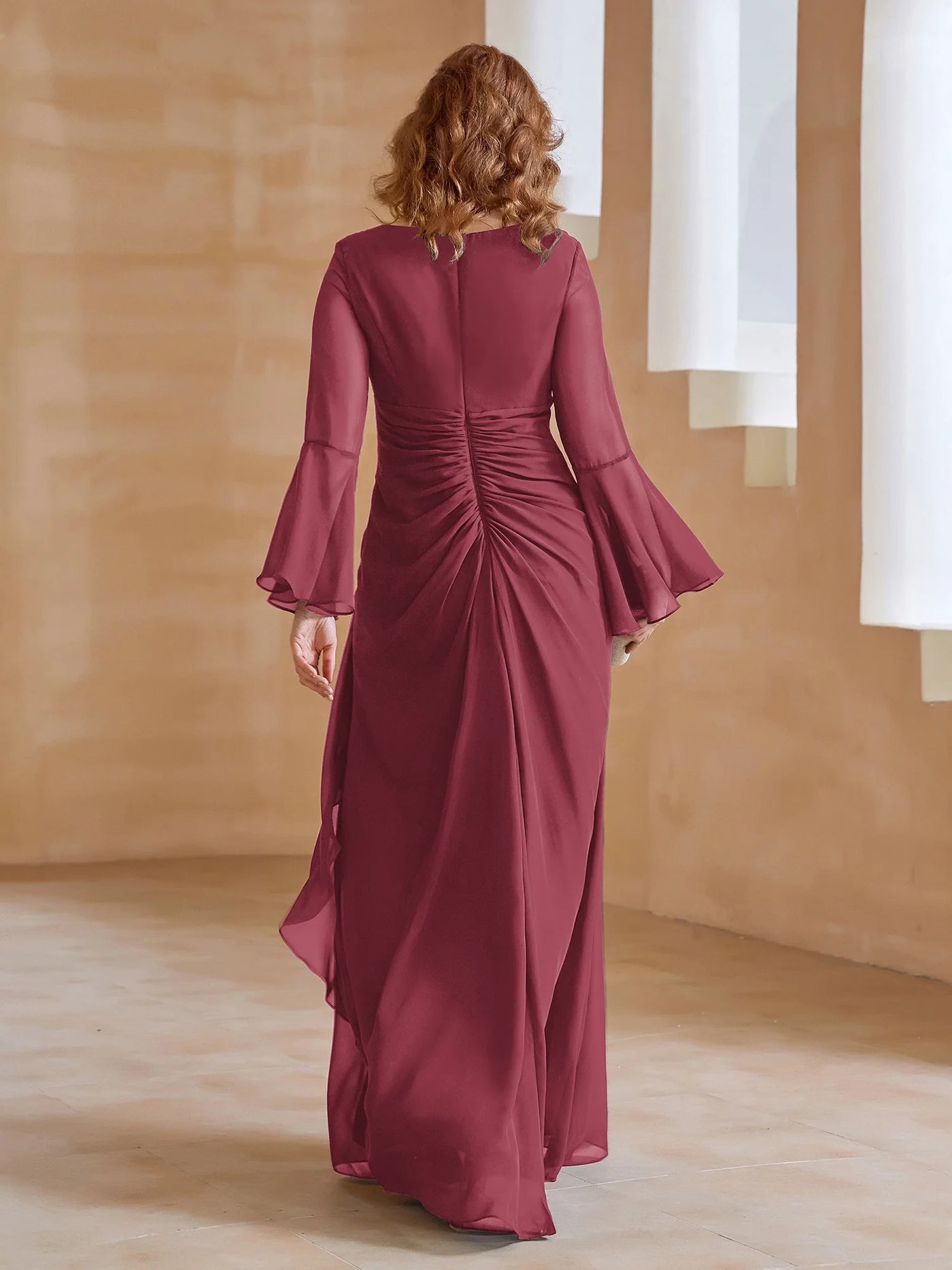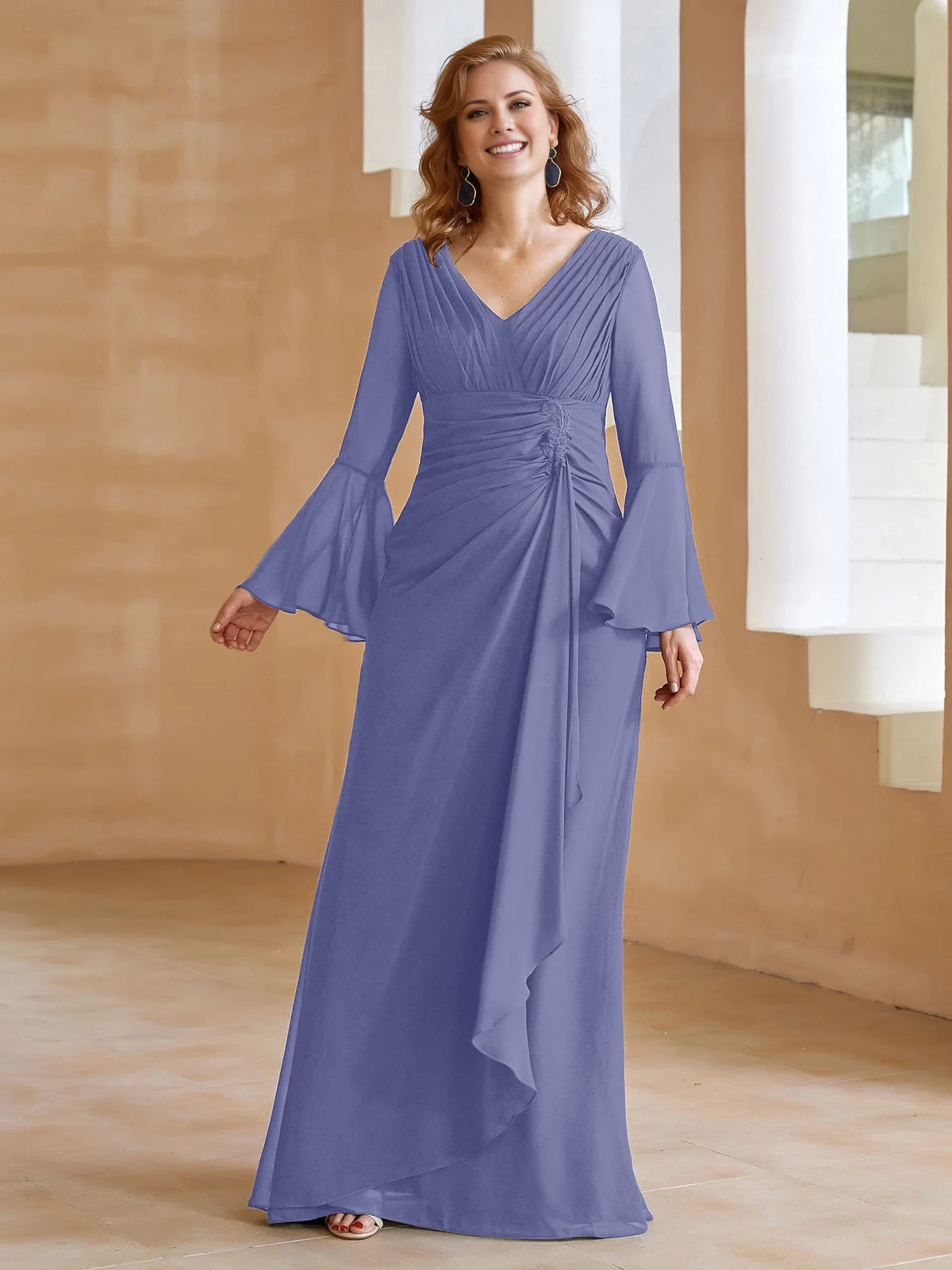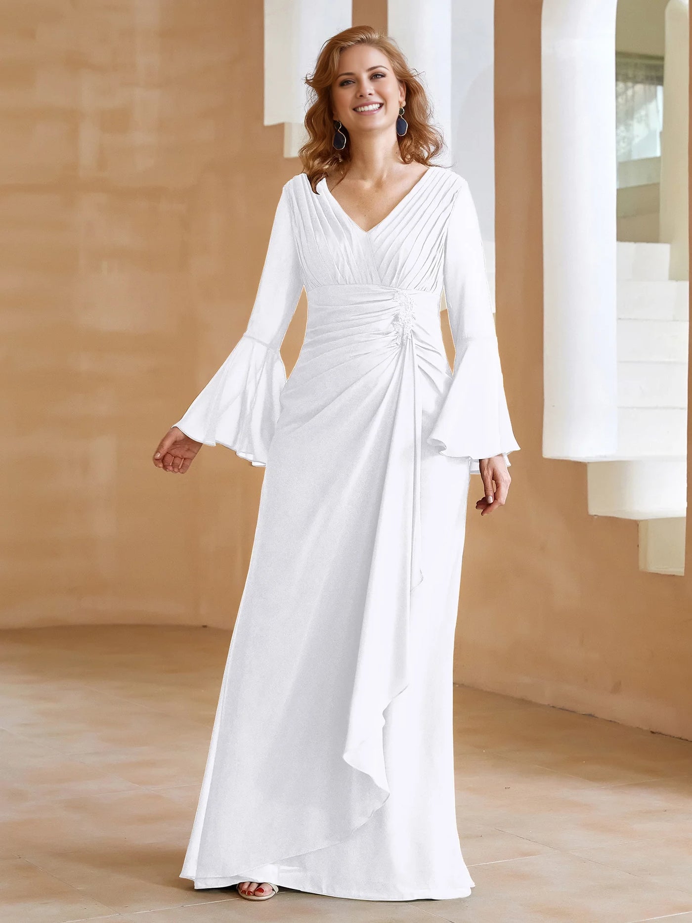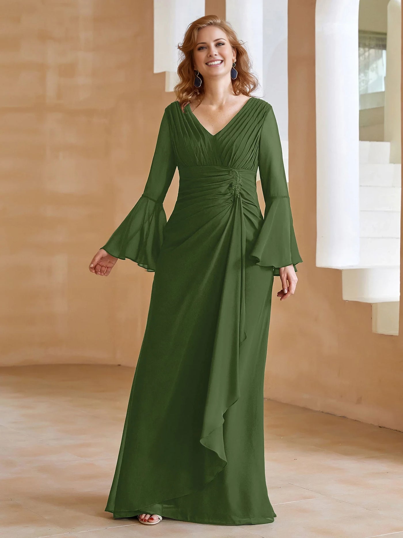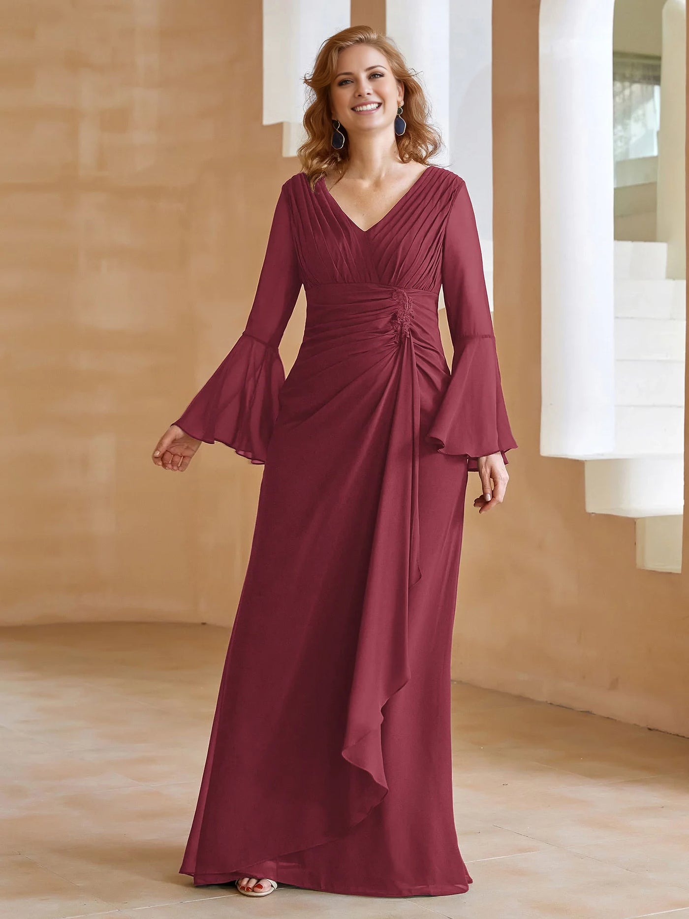 This elegant mother-of-the-bride dress features a pleated design with a flattering V-neckline and a floor-length silhouette, combining sophistication and timeless style.