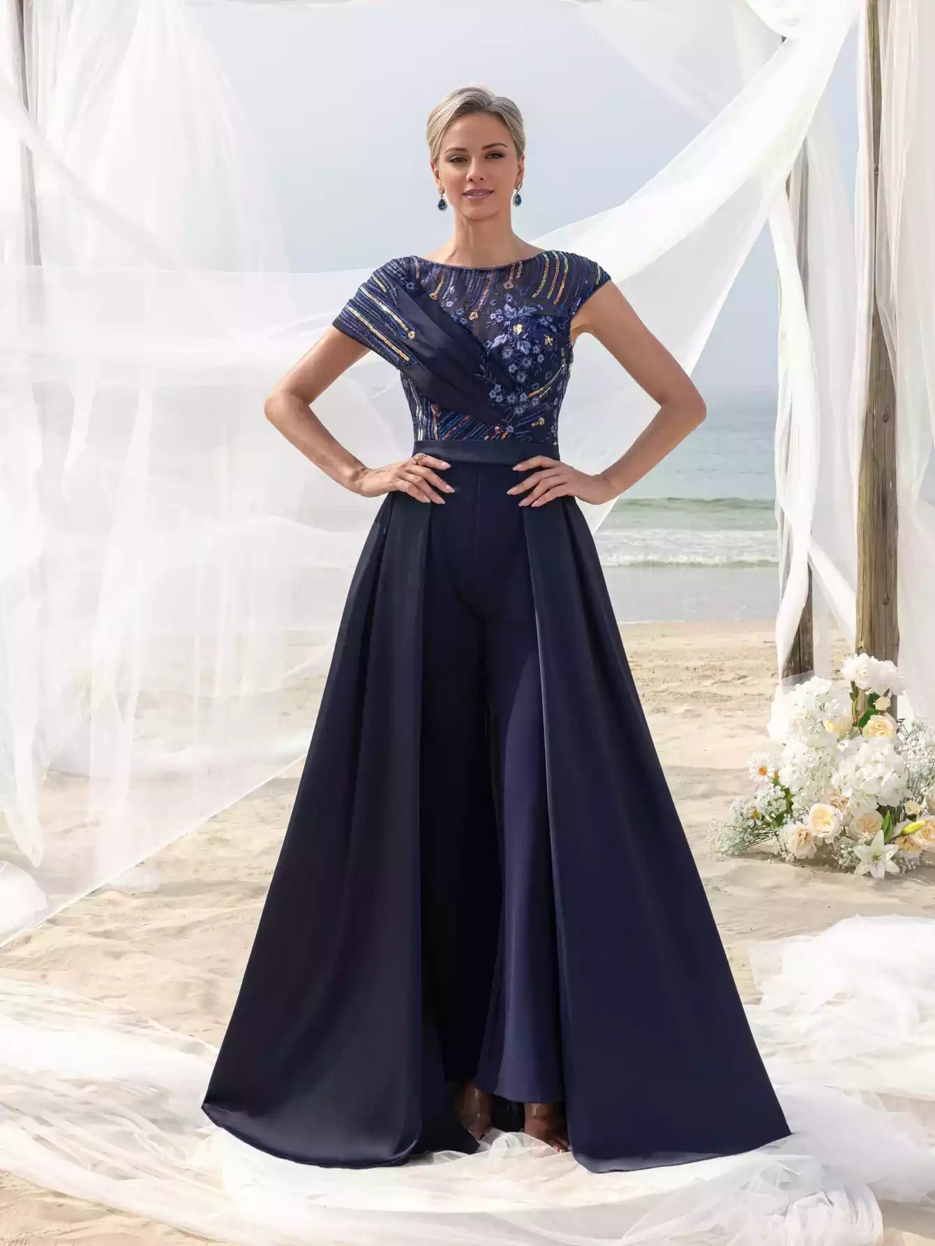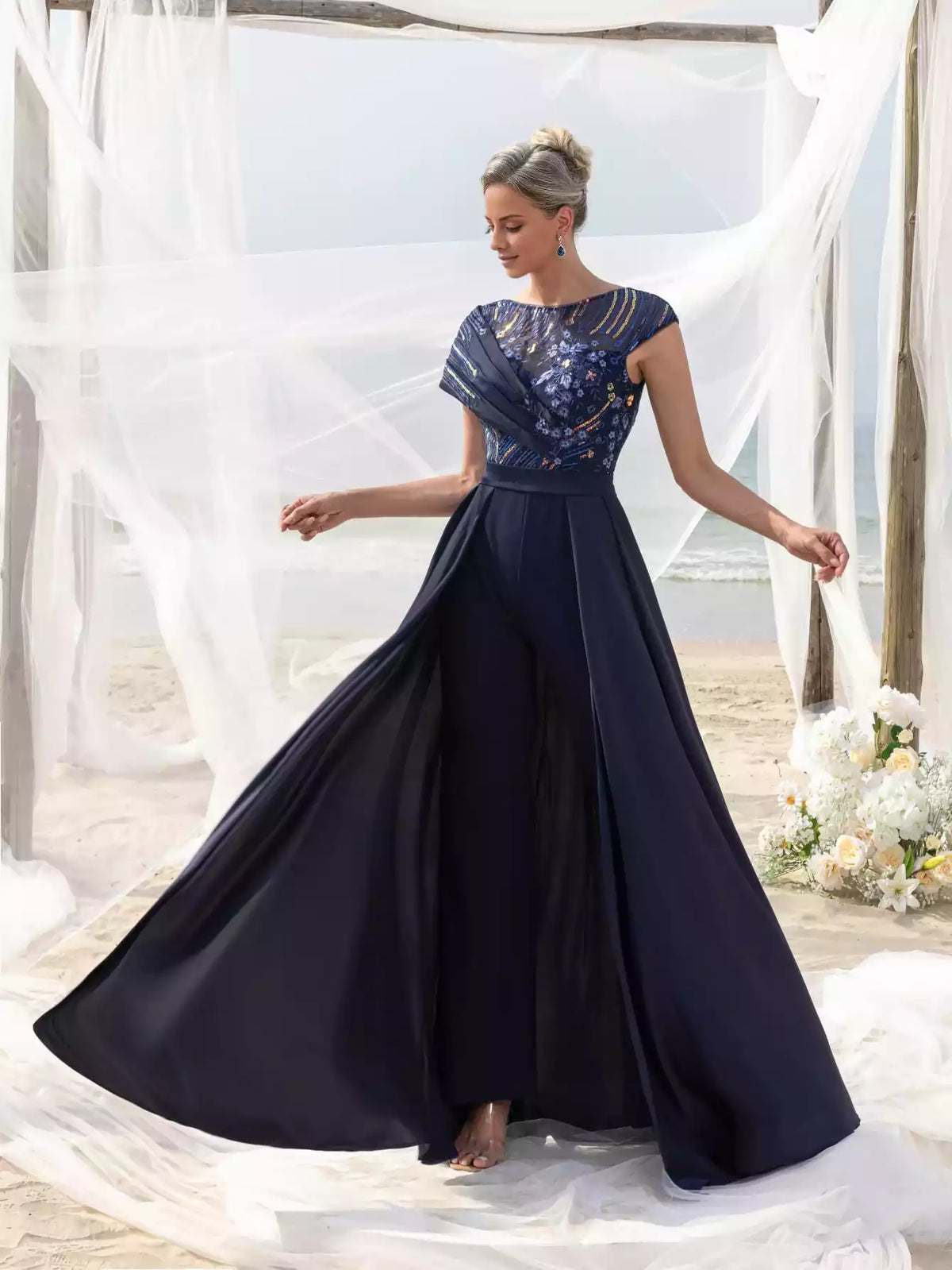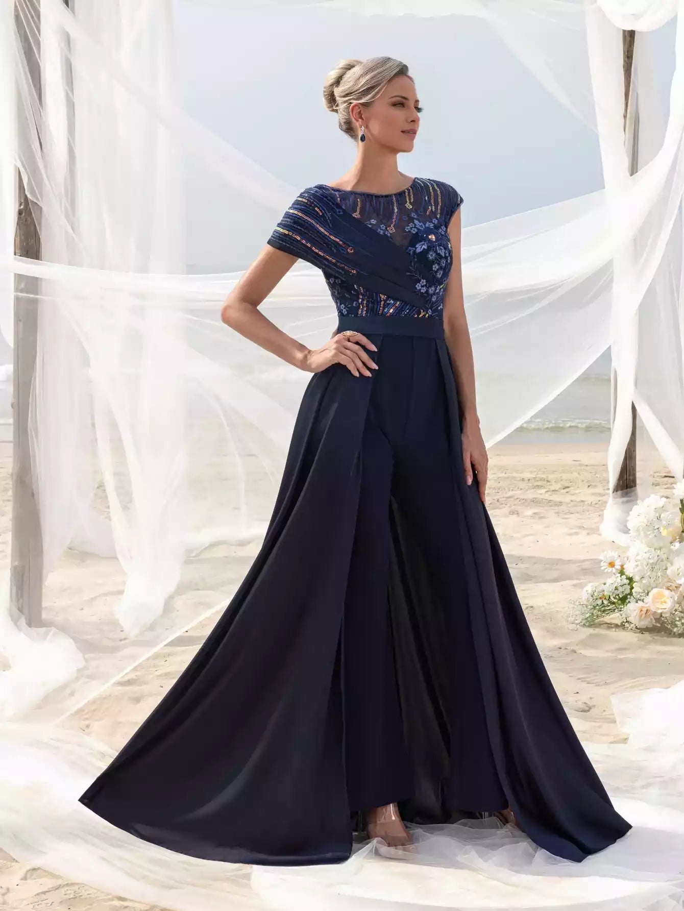 This sophisticated women's jumpsuit features intricate beading and sequins on smooth satin fabric, highlighted by a V-neckline and a low back. Designed with a flowing skirt, it serves as an exquisite choice for the mother of the bride.