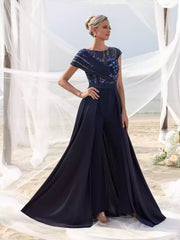 Womens' Elegant Beaded Sequined Satin Jumpsuit with V Neckline Low Back Flowing Skirt Mother of the Bride Dress