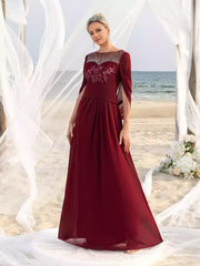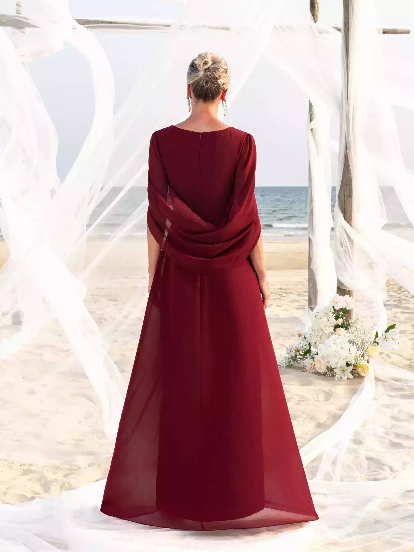 This elegant floor-length chiffon dress for women features a rhinestone-adorned neckline and delicate floral appliqué, making it an exquisite choice for the mother of the bride.