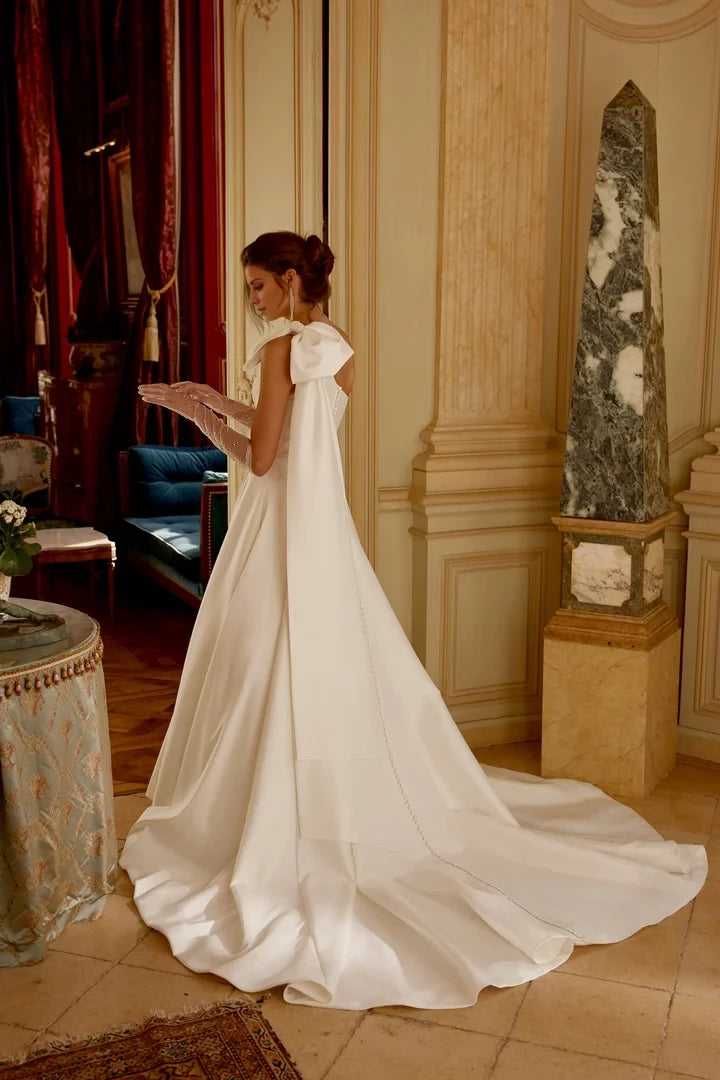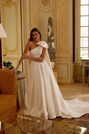 This elegant A-line gown features a one-shoulder neckline and includes a detachable bow, offering a versatile and sophisticated option for wedding attire.