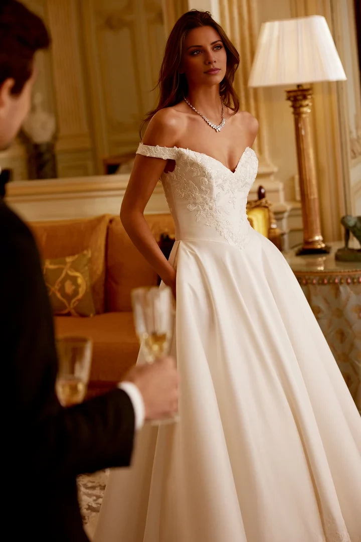This wedding dress features a crepe fit-and-flare silhouette complemented by an illusion notched Sabrina neckline, offering a sophisticated and elegant look for your special day.