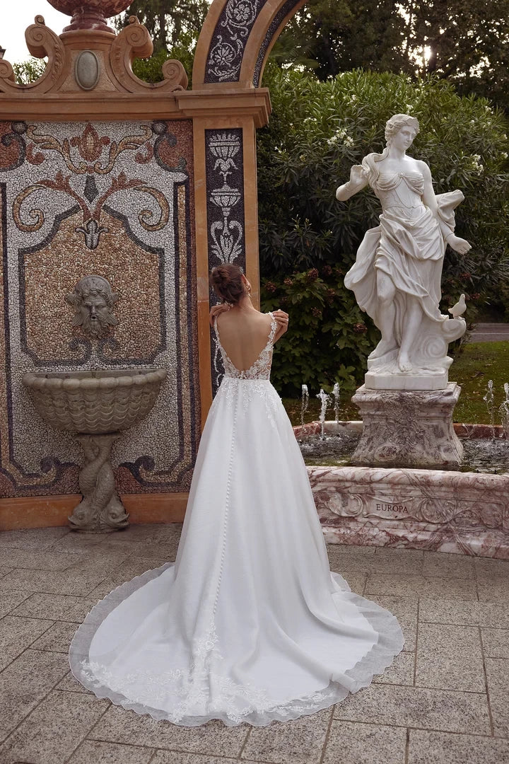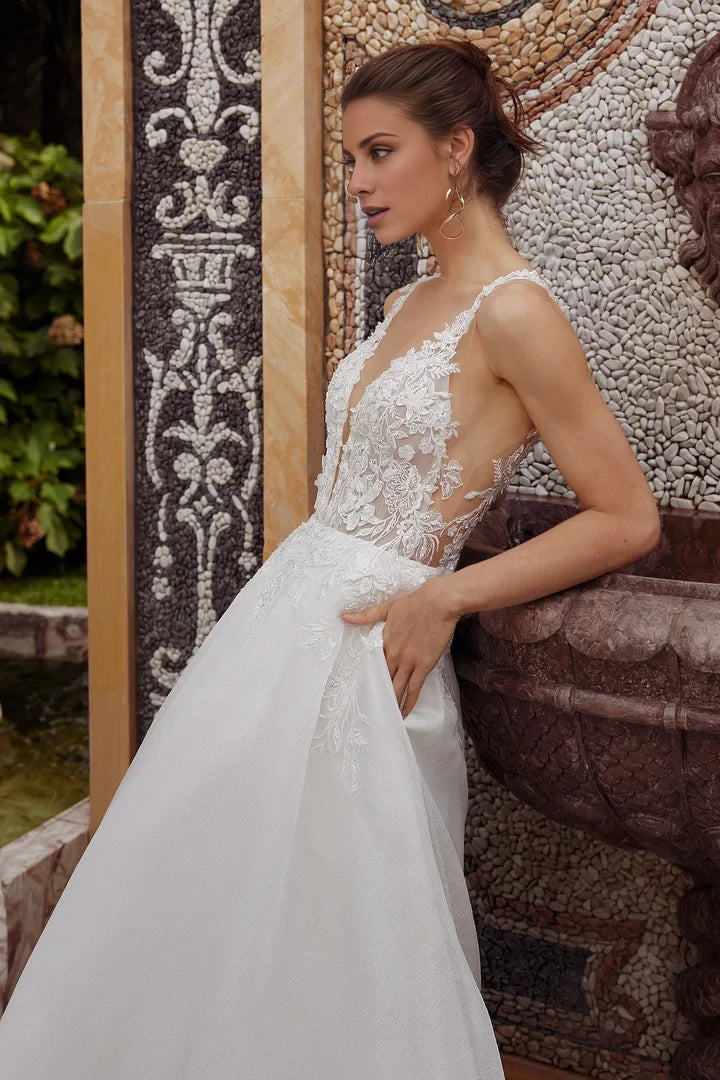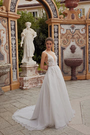This wedding dress showcases an A-line silhouette with a crushed organza skirt and a striking plunging neckline, offering a sophisticated and contemporary bridal style.