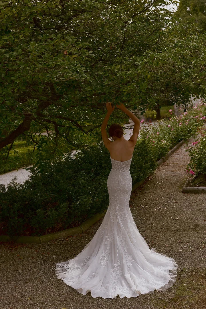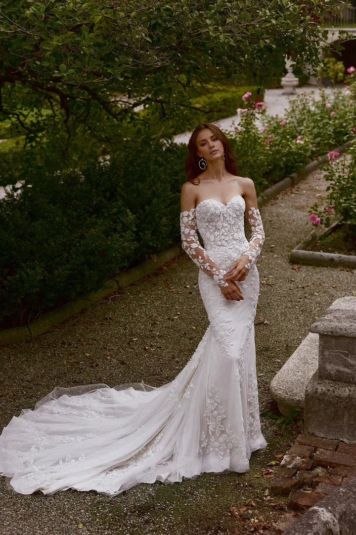 This strapless wedding dress features intricate allover beading and lace detailing, designed in a flattering fit and flare silhouette for an elegant bridal look.