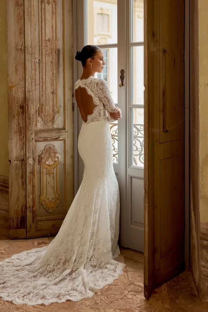 This wedding dress features a fit and flare silhouette crafted from intricate allover corded Alençon lace, complemented by a distinctive keyhole back design.