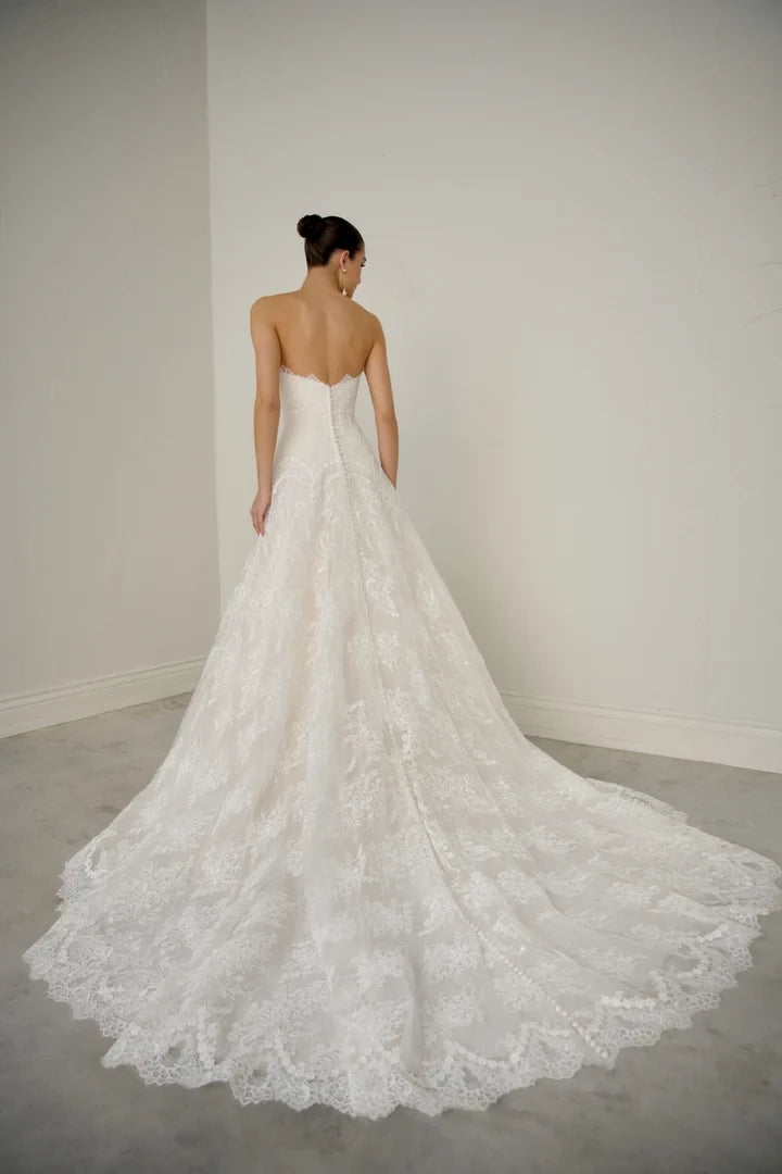 This wedding dress features an allover lace design with an A-line silhouette, complemented by a dropped waist and a straight neckline for a refined and elegant look.