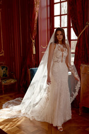 This wedding dress features an allover lace design with a fit and flare silhouette, complemented by a jewel neckline and a keyhole back detail.