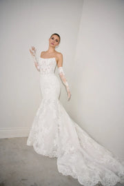 This wedding dress features an allover lace mermaid silhouette, complemented by a sheer bodice and visible boning for a sophisticated and structured look.