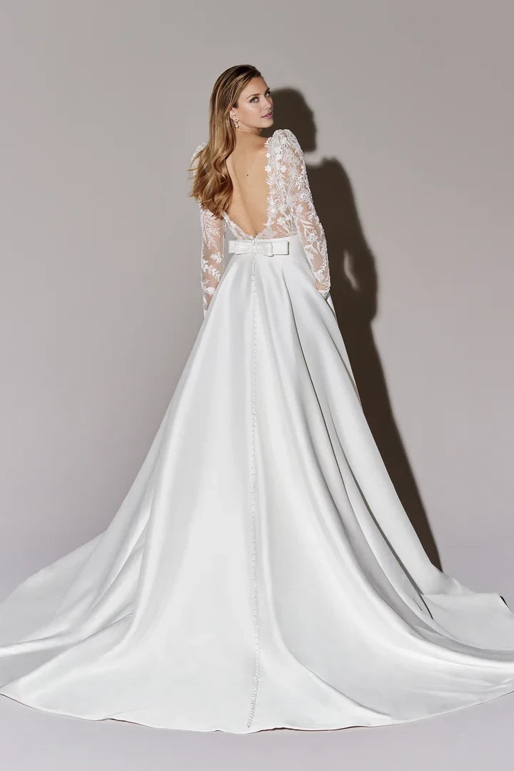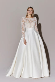 This wedding dress features a classic ball gown silhouette complemented by an illusion Sabrina neckline, offering an elegant and timeless bridal look.