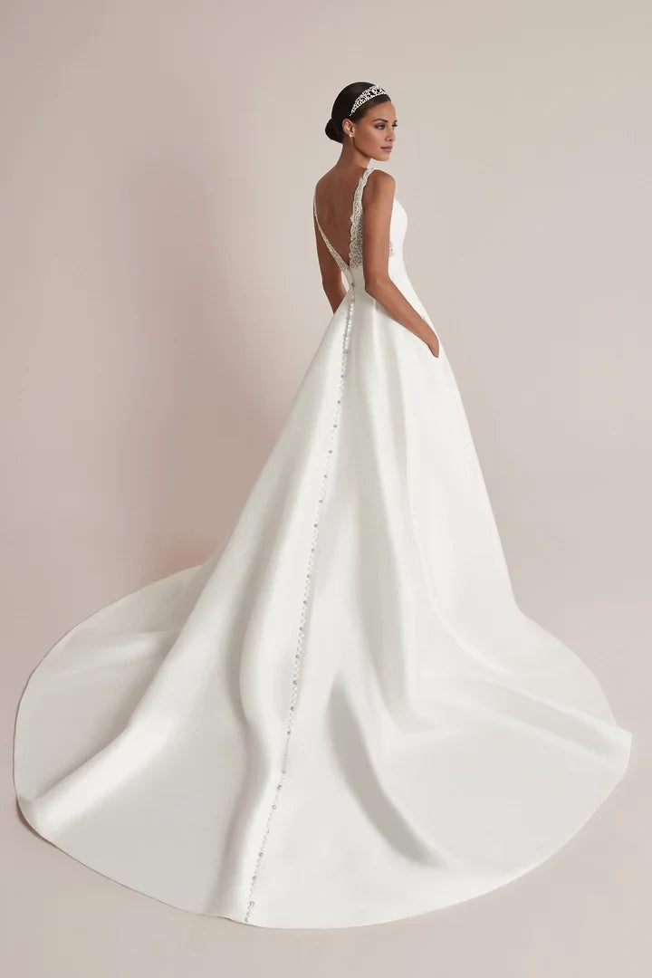 This wedding dress features a classic ball gown silhouette complemented by a Sabrina neckline and an intricately beaded back, combining timeless elegance with detailed craftsmanship.
