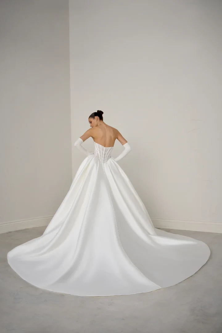 This wedding dress features a ball gown silhouette complemented by a sheer tulle bodice with visible boning, combining classic elegance with modern detailing.