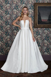 This wedding dress features a strapless neckline with a subtle notch and is adorned with prominent floral appliques, designed in a classic ball gown silhouette.