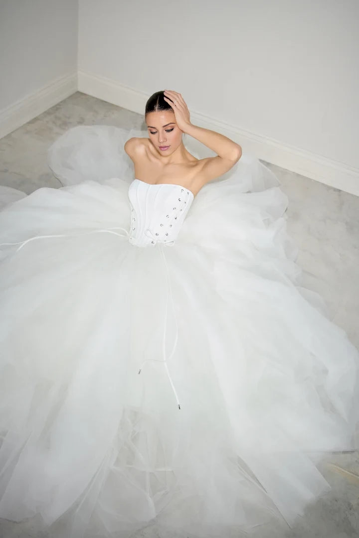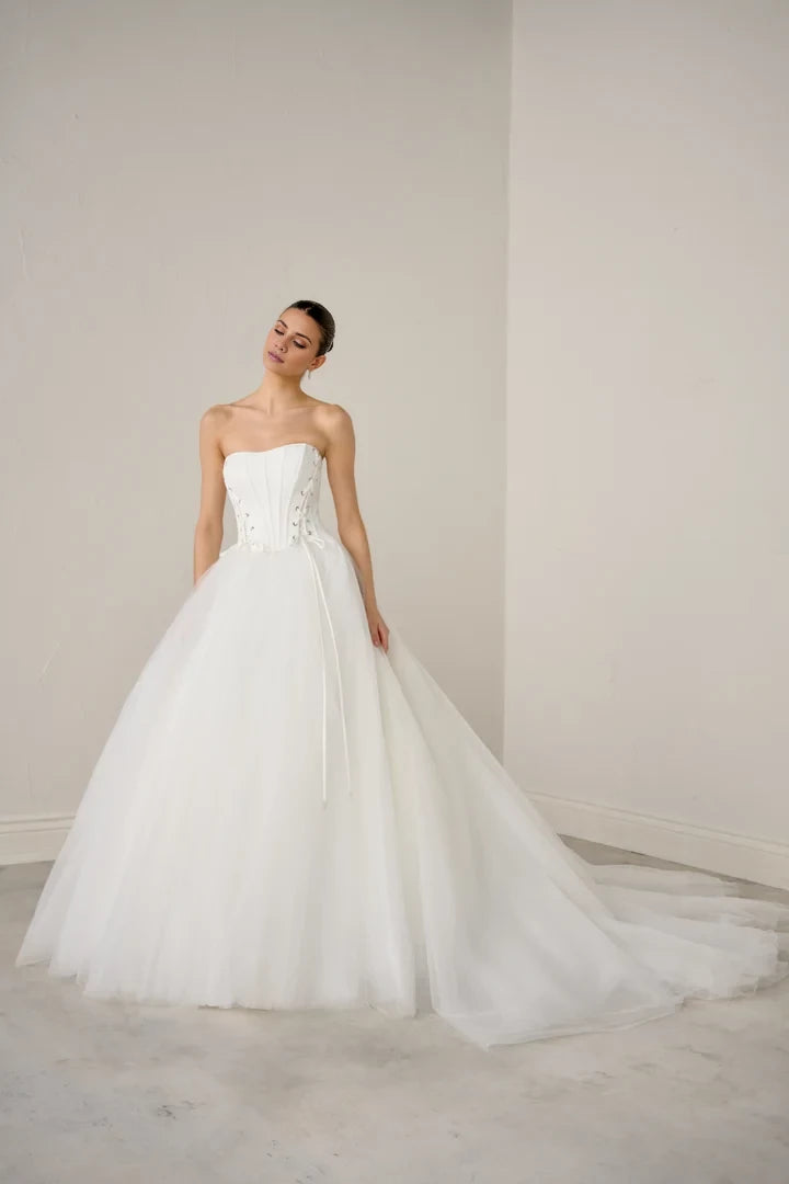 This wedding dress features a basque waist design with a tulle ball gown silhouette, complemented by front corset ties for an elegant and structured fit.