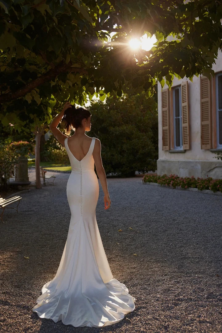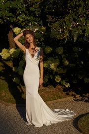 This fit and flare wedding gown features a charmeuse fabric and a ruched deep V-neckline, combining elegance with a flattering silhouette for a sophisticated bridal look.