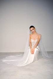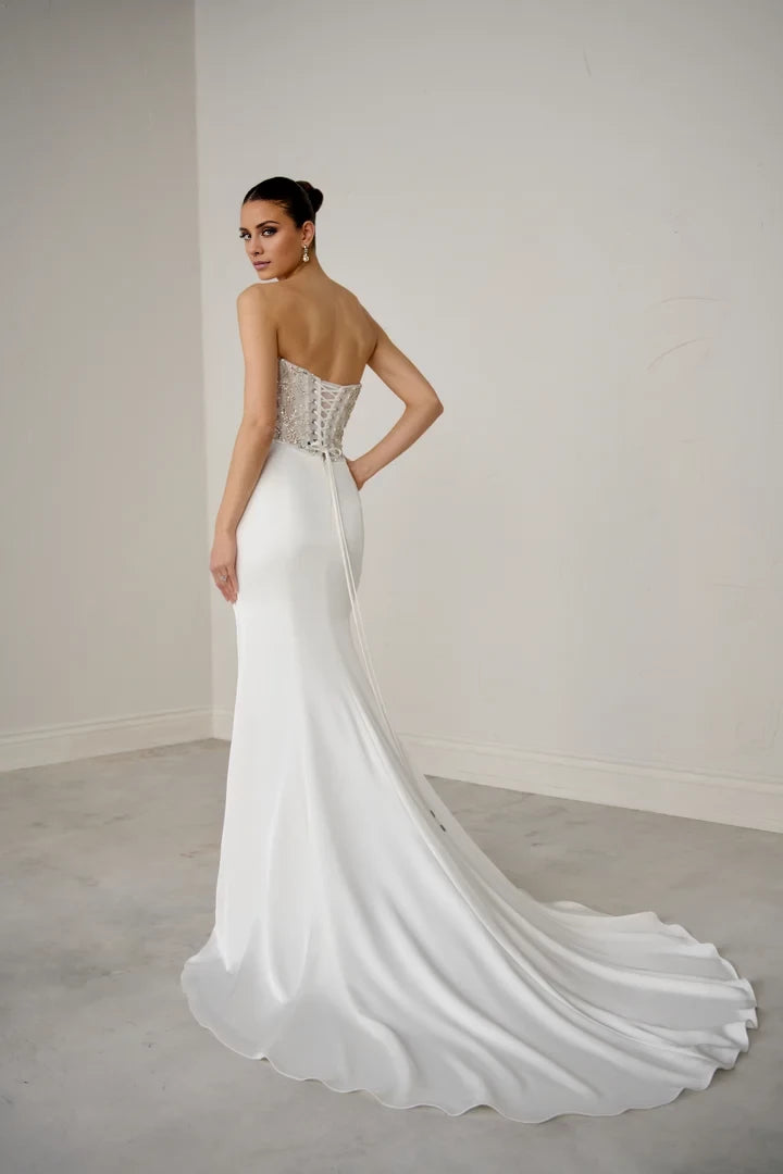 This wedding dress features a charmeuse fit-and-flare silhouette complemented by a beaded illusion bodice, combining elegance with intricate detailing for a sophisticated bridal look.