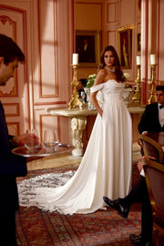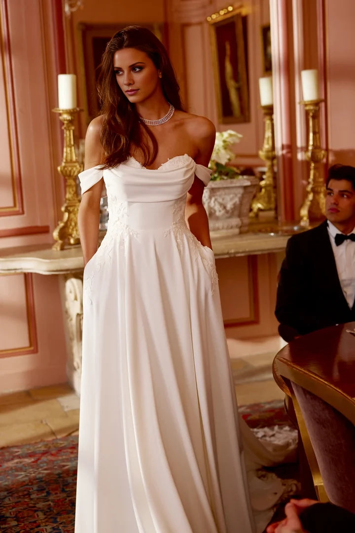 This wedding dress features a crepe A-line silhouette, highlighted by a sweetheart neckline and elegant cowl detailing for a refined bridal look.