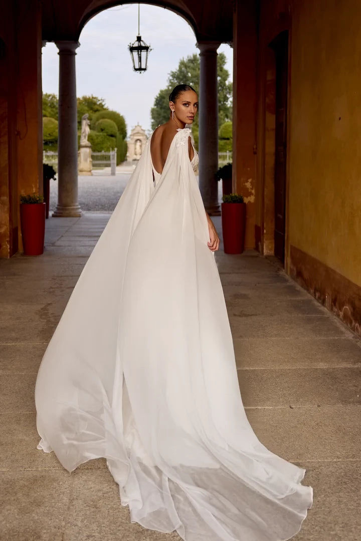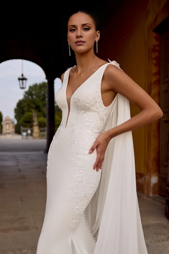 This wedding dress features a crepe fit-and-flare silhouette, adorned with delicate lace appliqués and a deep plunging V-neckline, combining elegance with a modern touch.