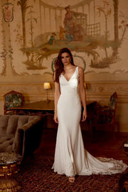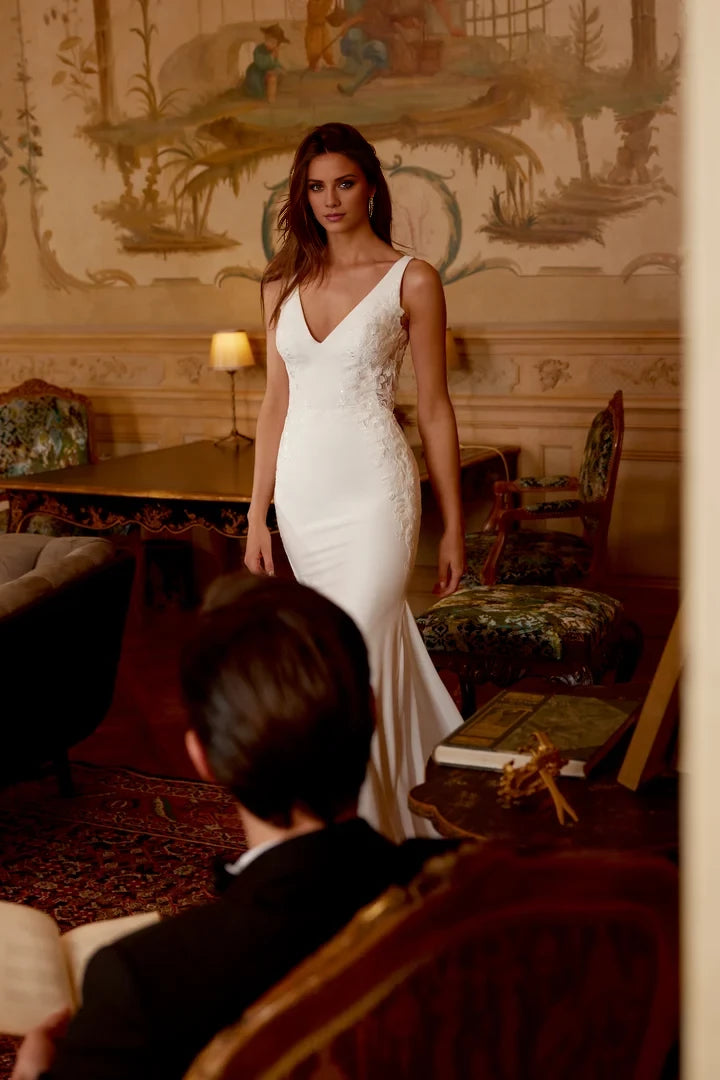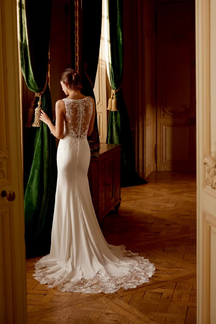 This wedding dress features a crepe fit-and-flare silhouette, adorned with delicate lace appliqués and an illusion back, combining elegance with modern design.
