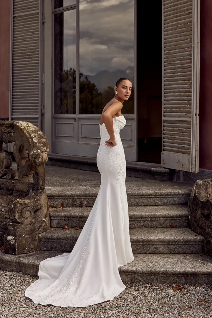 This wedding dress features a crepe fit-and-flare silhouette adorned with matte lace appliqués, combining elegant structure with delicate detailing for a refined bridal look.