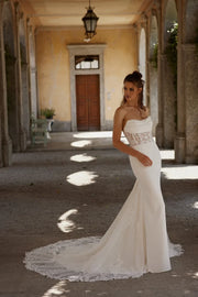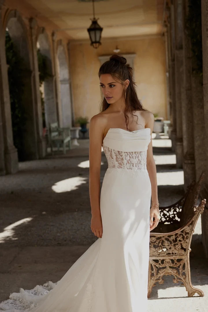 This wedding dress features a crepe fit-and-flare silhouette complemented by a pleated scoop neckline, offering an elegant and flattering design for brides.