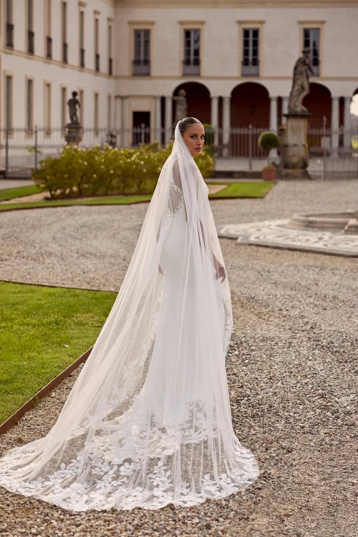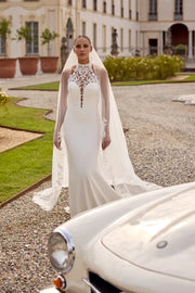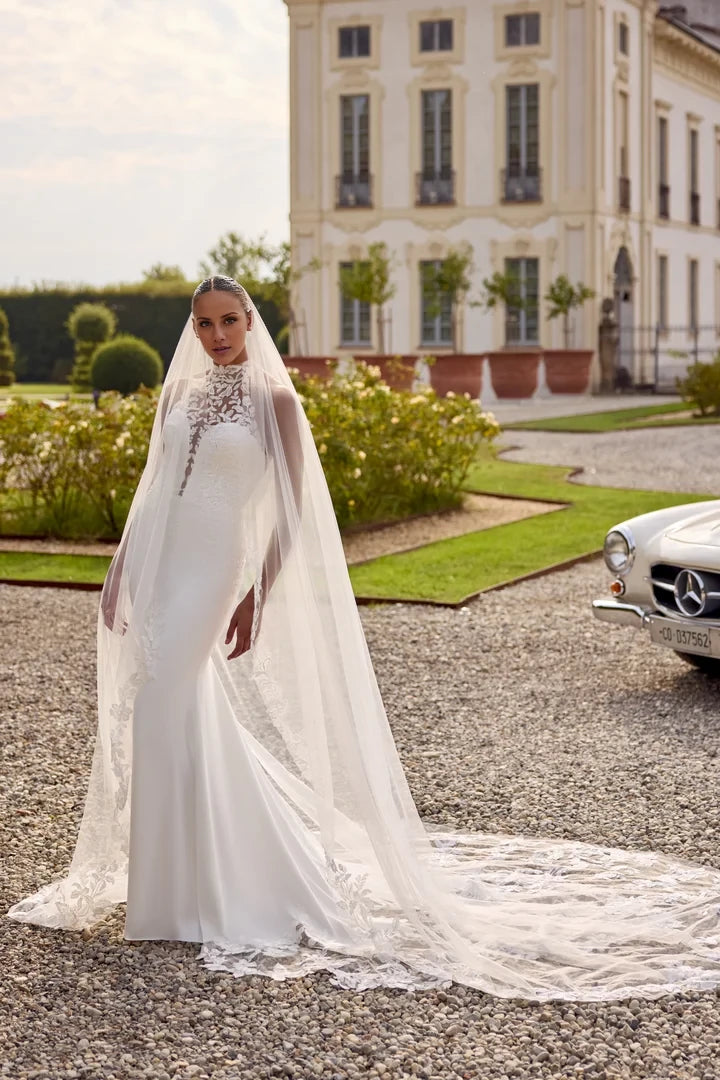 This wedding dress features a crepe fit-and-flare silhouette, complemented by a jewel neckline and a delicate illusion back, combining elegance with modern design.