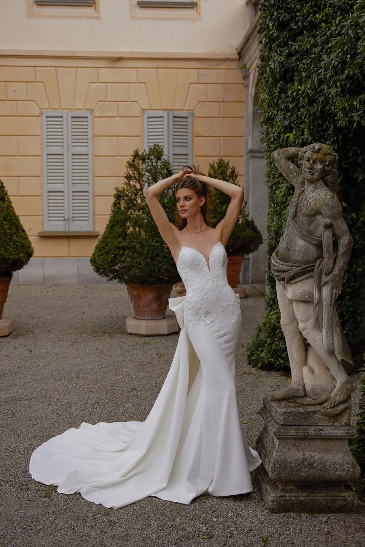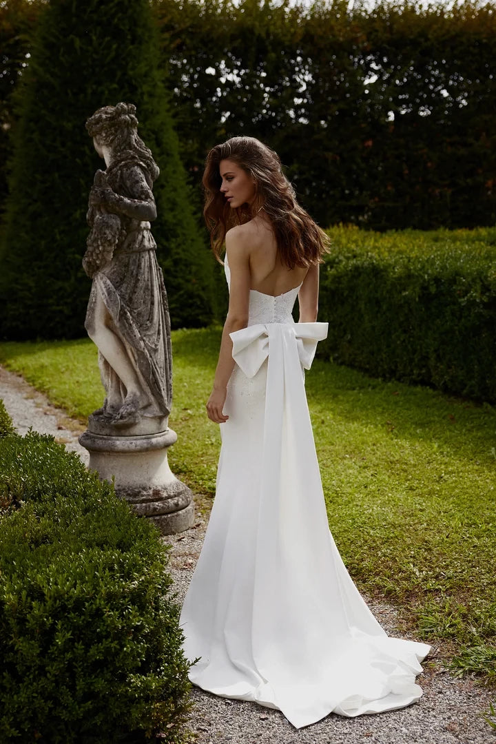This wedding dress features a crepe fit-and-flare silhouette, highlighted by a pointed neckline and a detachable bow for versatile styling.